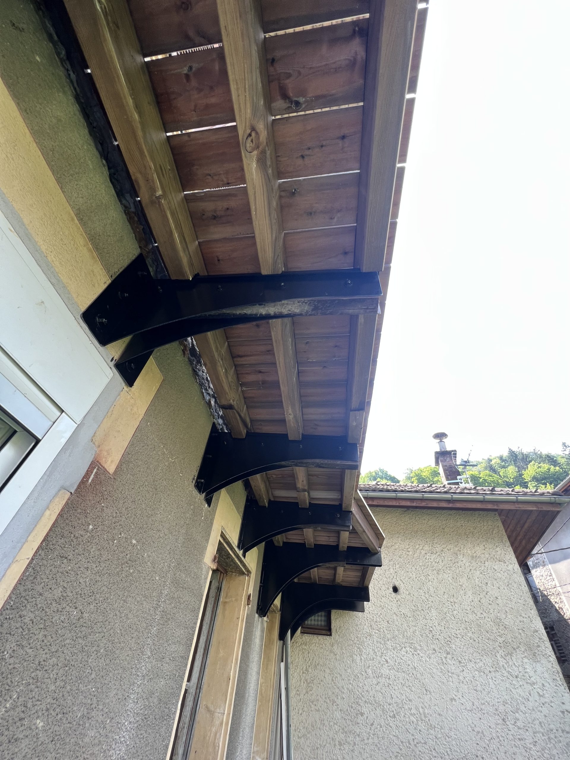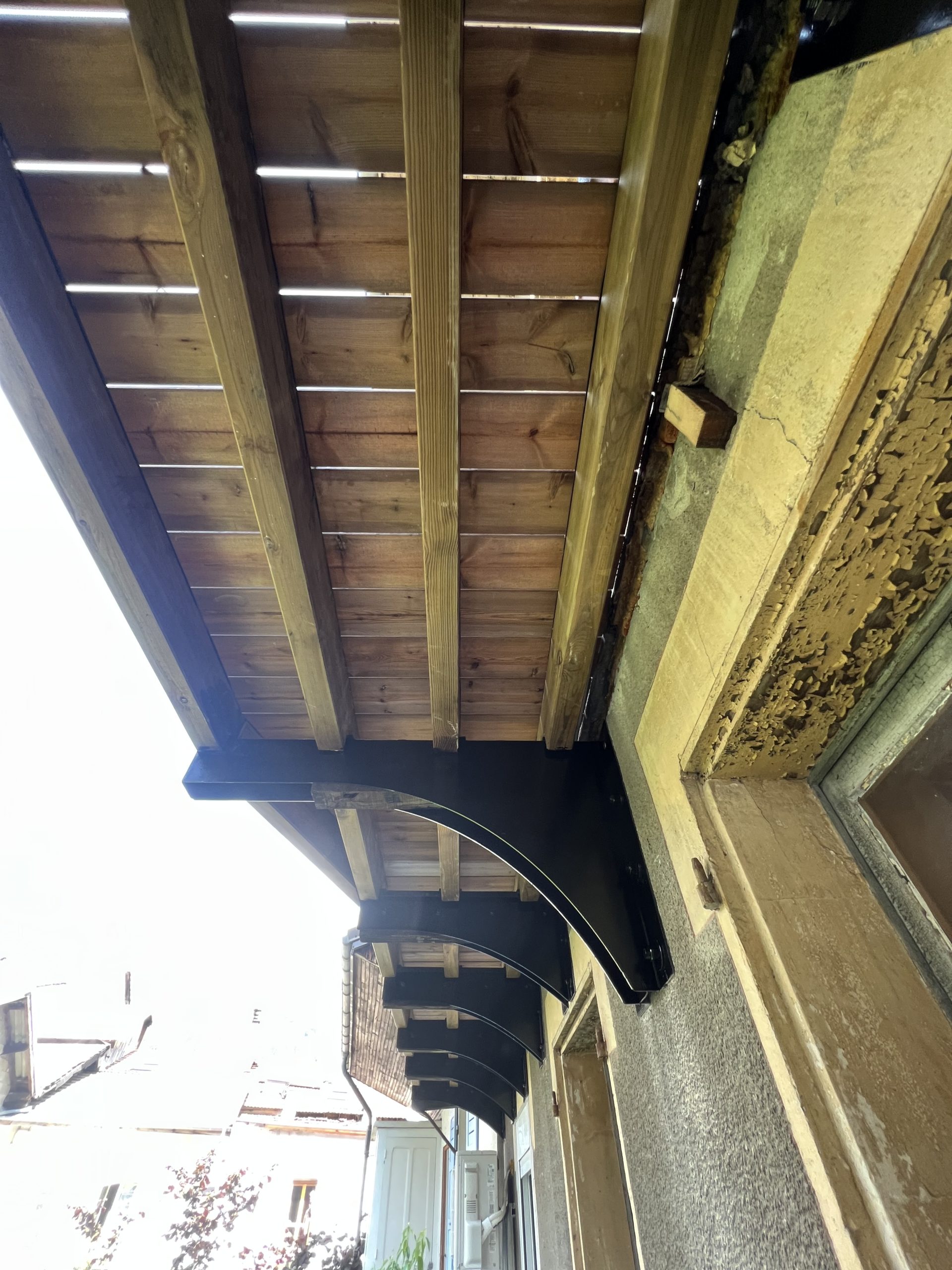 Conception, fabrication et installation d’un Balcon en acier et en pin classe 4. Les corbeaux ont été taillés sur mesure et fixé de par en part du mur d’épaisseur 70cm.