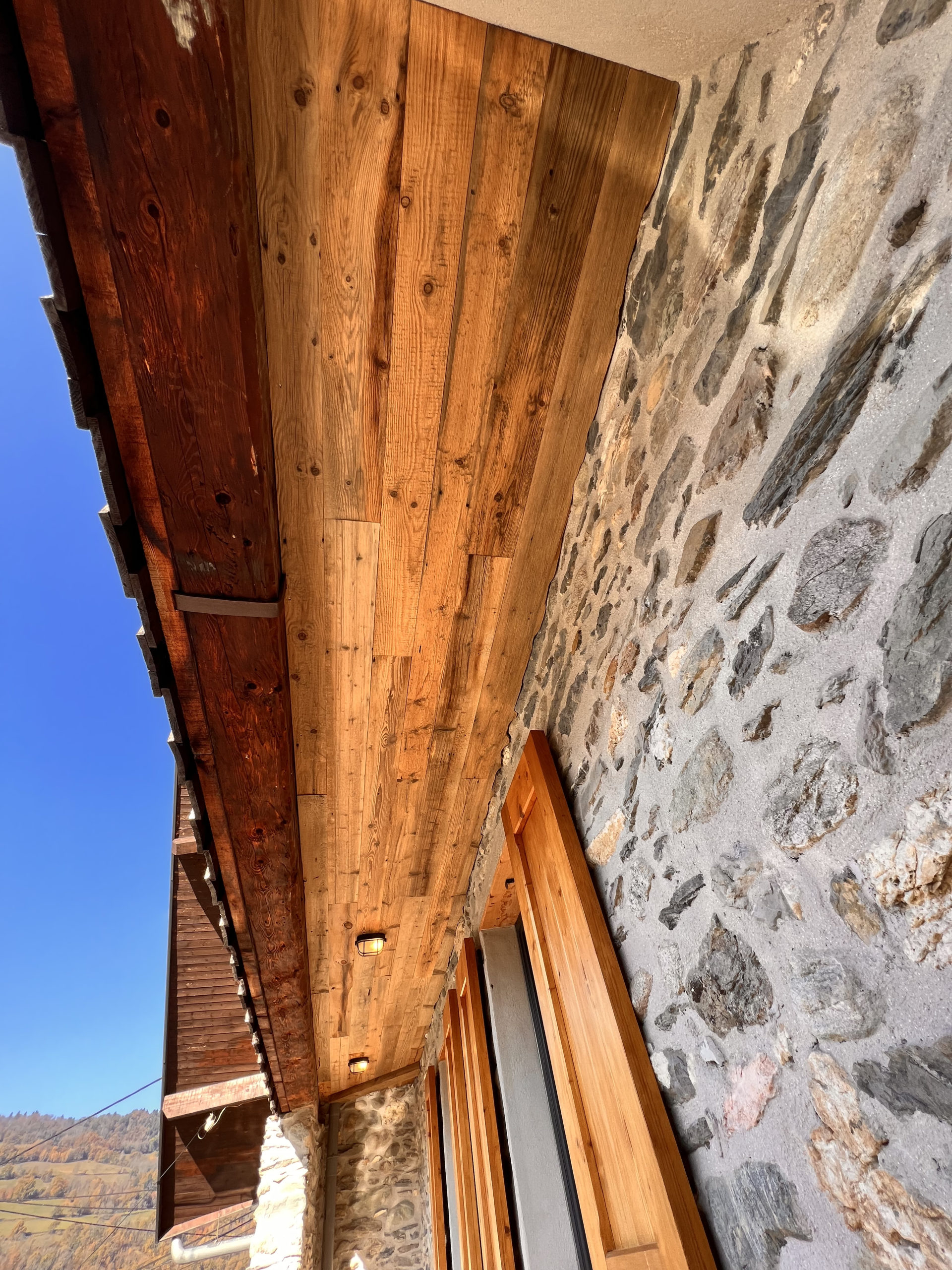 Le bardage a été choisi en vieux bois récupérés dans d’anciens chalets et qui ont été recyclés et retravaillés. En effet, nous avons voulu que le bois se fonde parfaitement avec le bois déjà existant sur la maison. Le bardage est la finition extérieure de l’étage que nous avons isolés à la laine de bois et de roche.