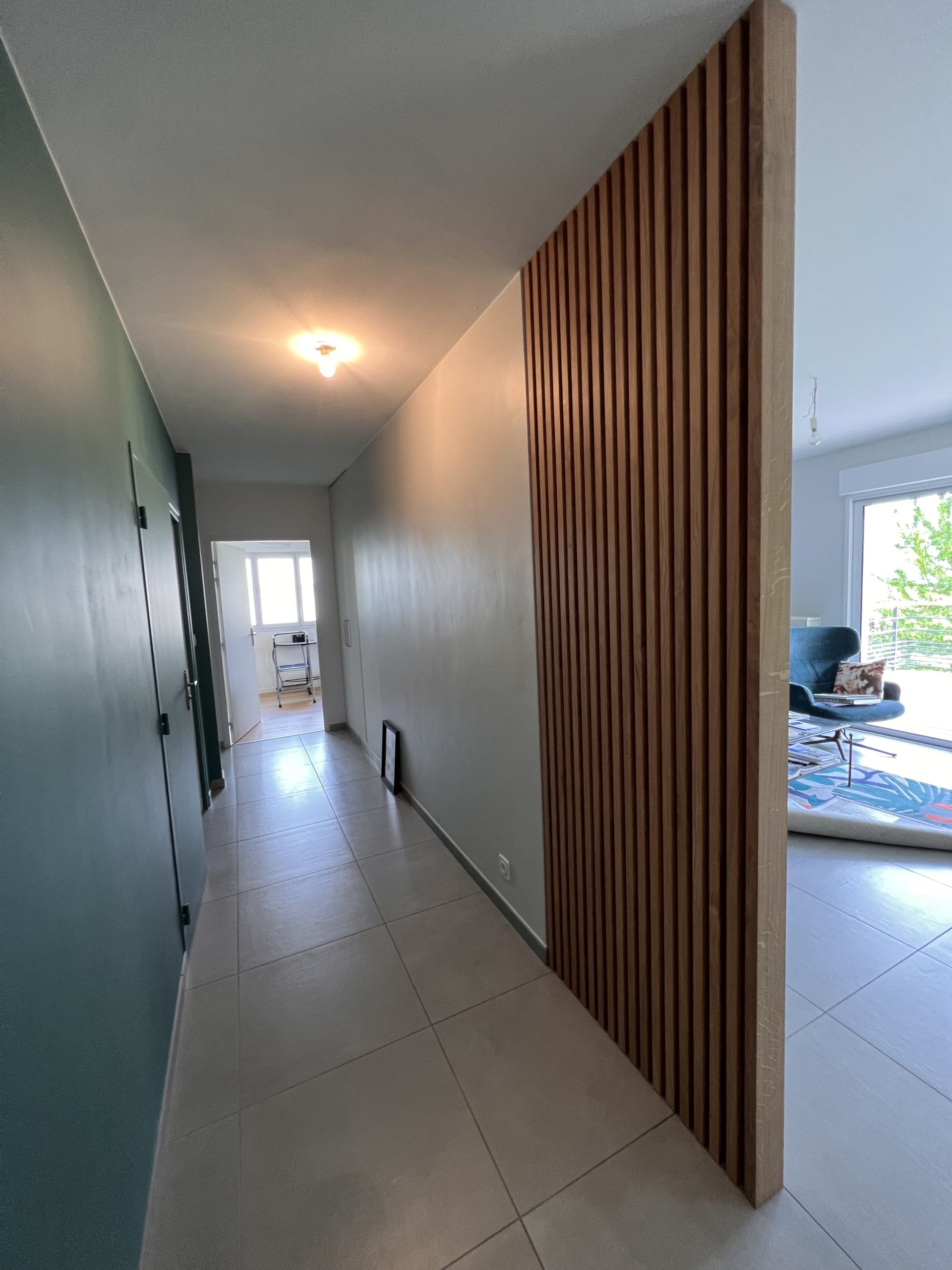 Conception, fabrication et installation d’un claustra dans la continuité d’un mur. En collaboration avec la cliente, nous avons opté pour un claustra en chêne sur fond noir mat qui permet de prolonger son mur tout en étant un élément décoratif. Grâce à notre nouveau fournisseur, nous avons pu nous procurer du chêne issu d’une filière locale. En effet, ce chêne provient des forêts d’Allevard.