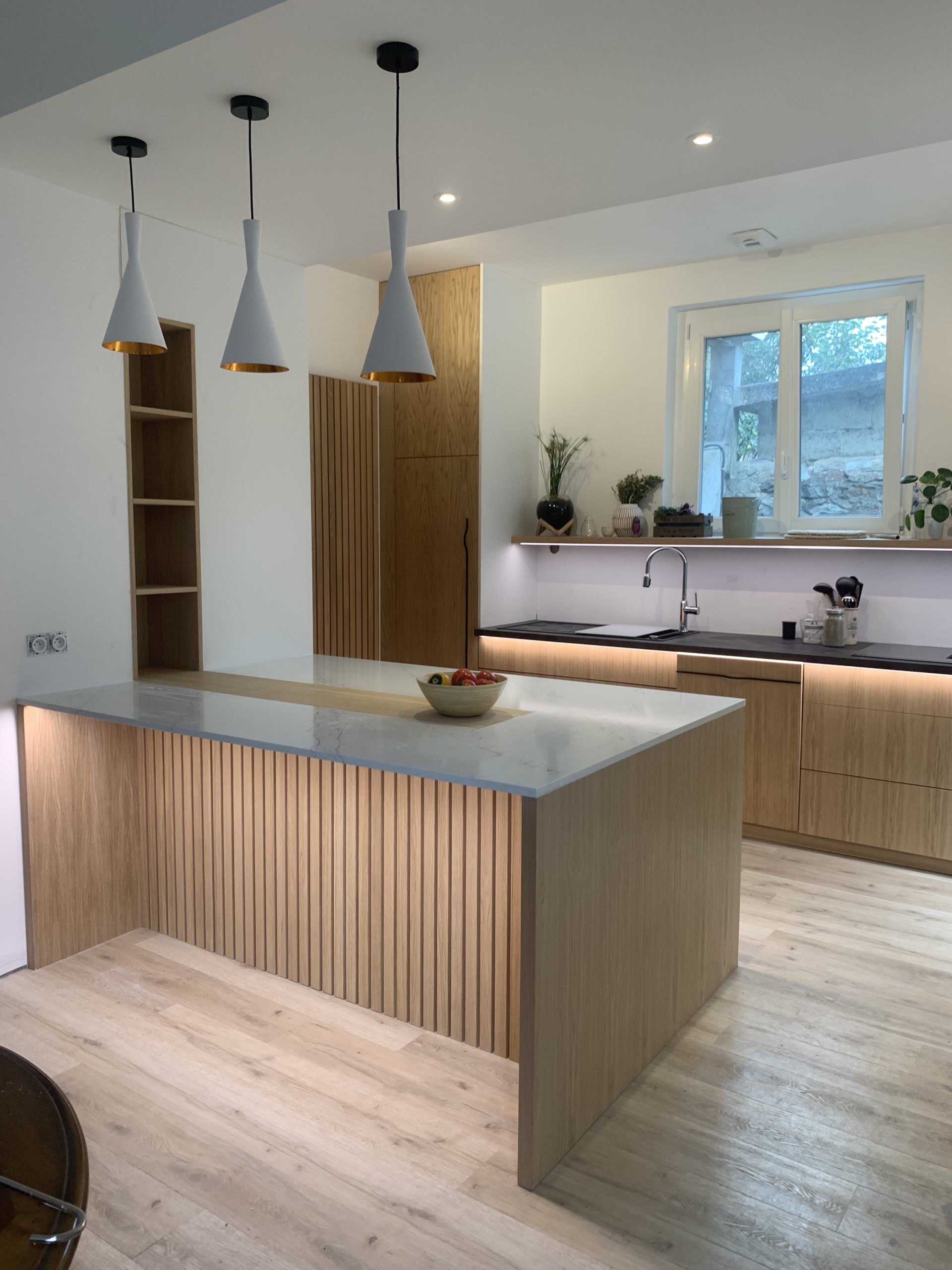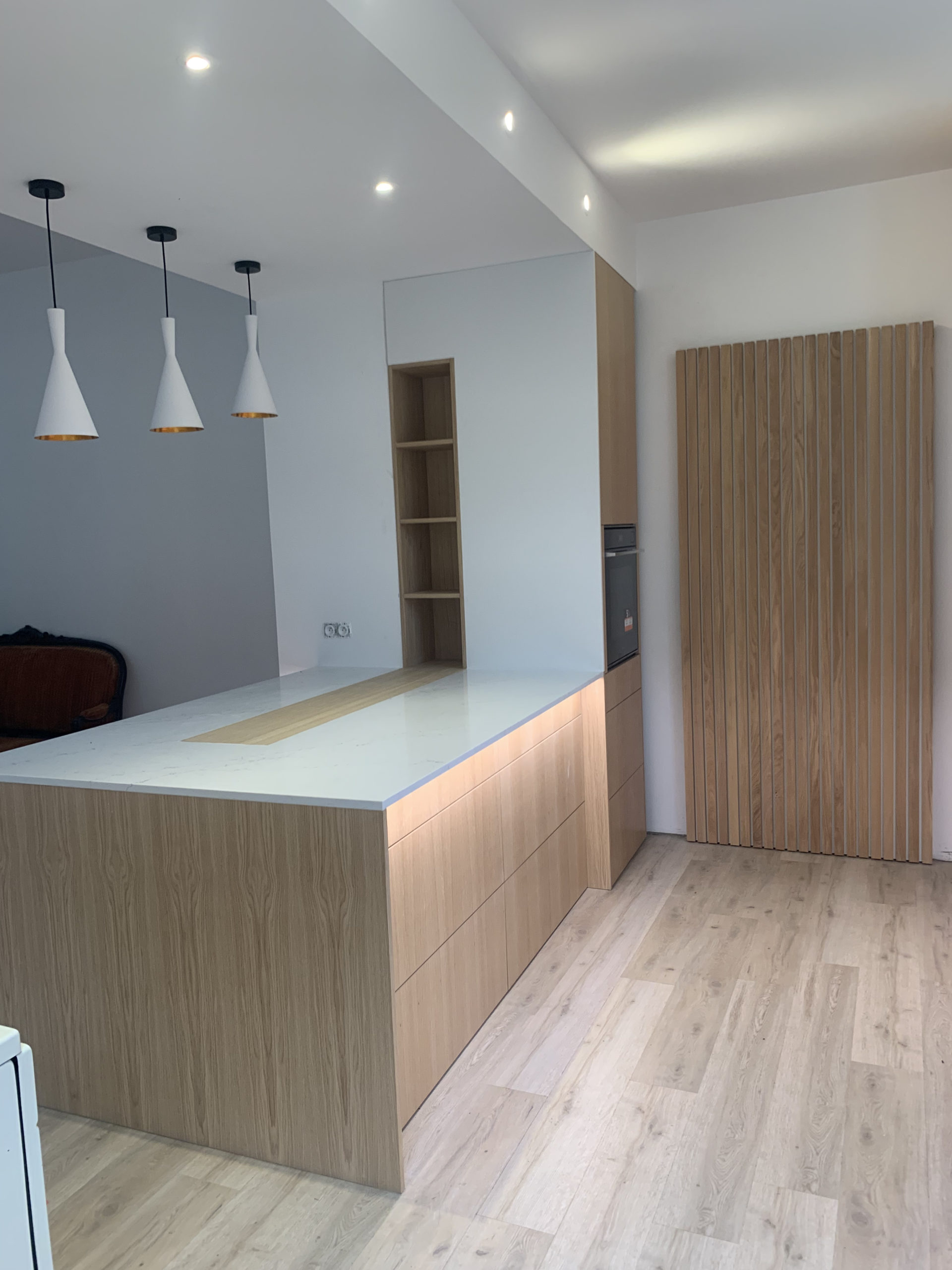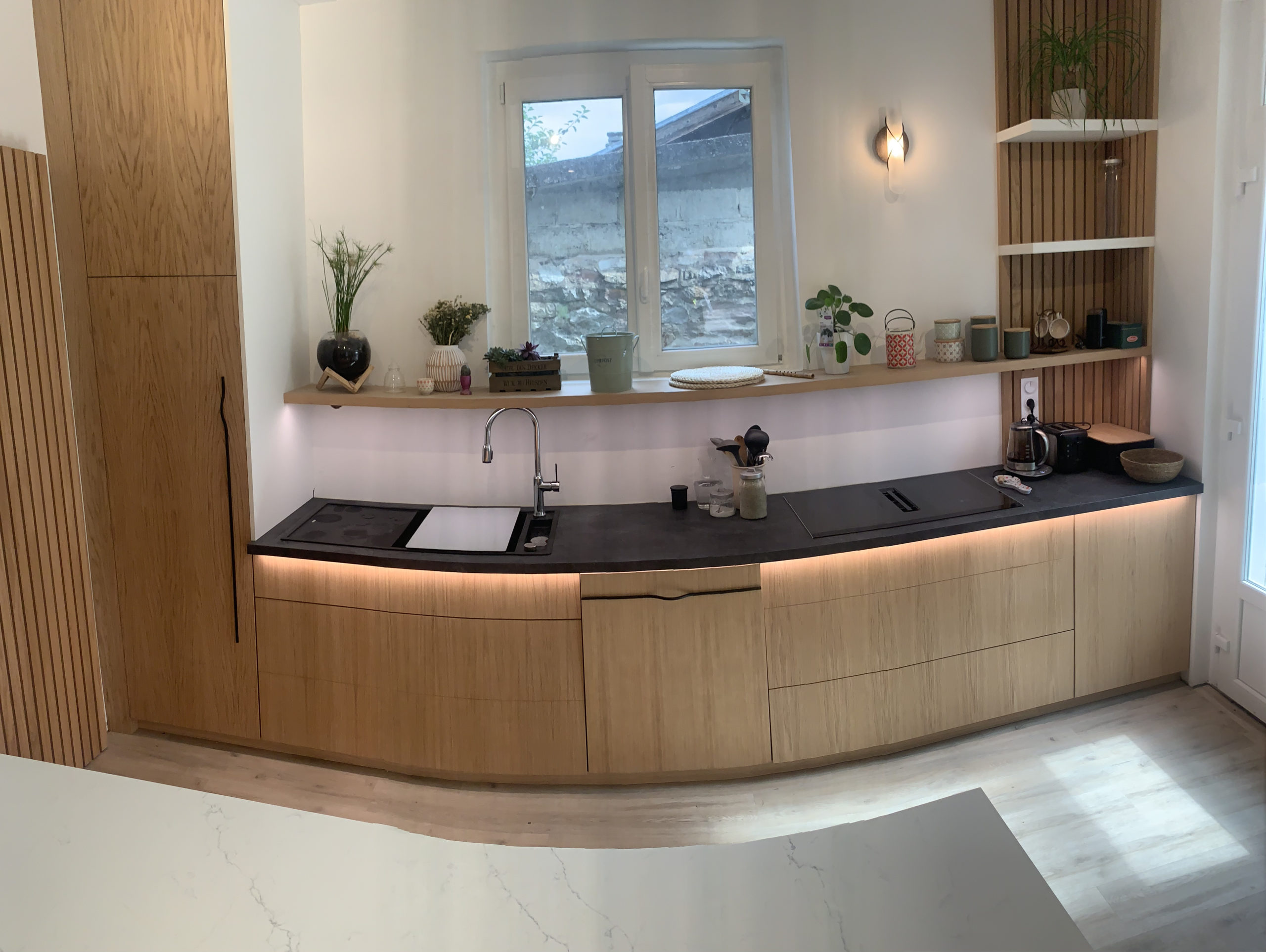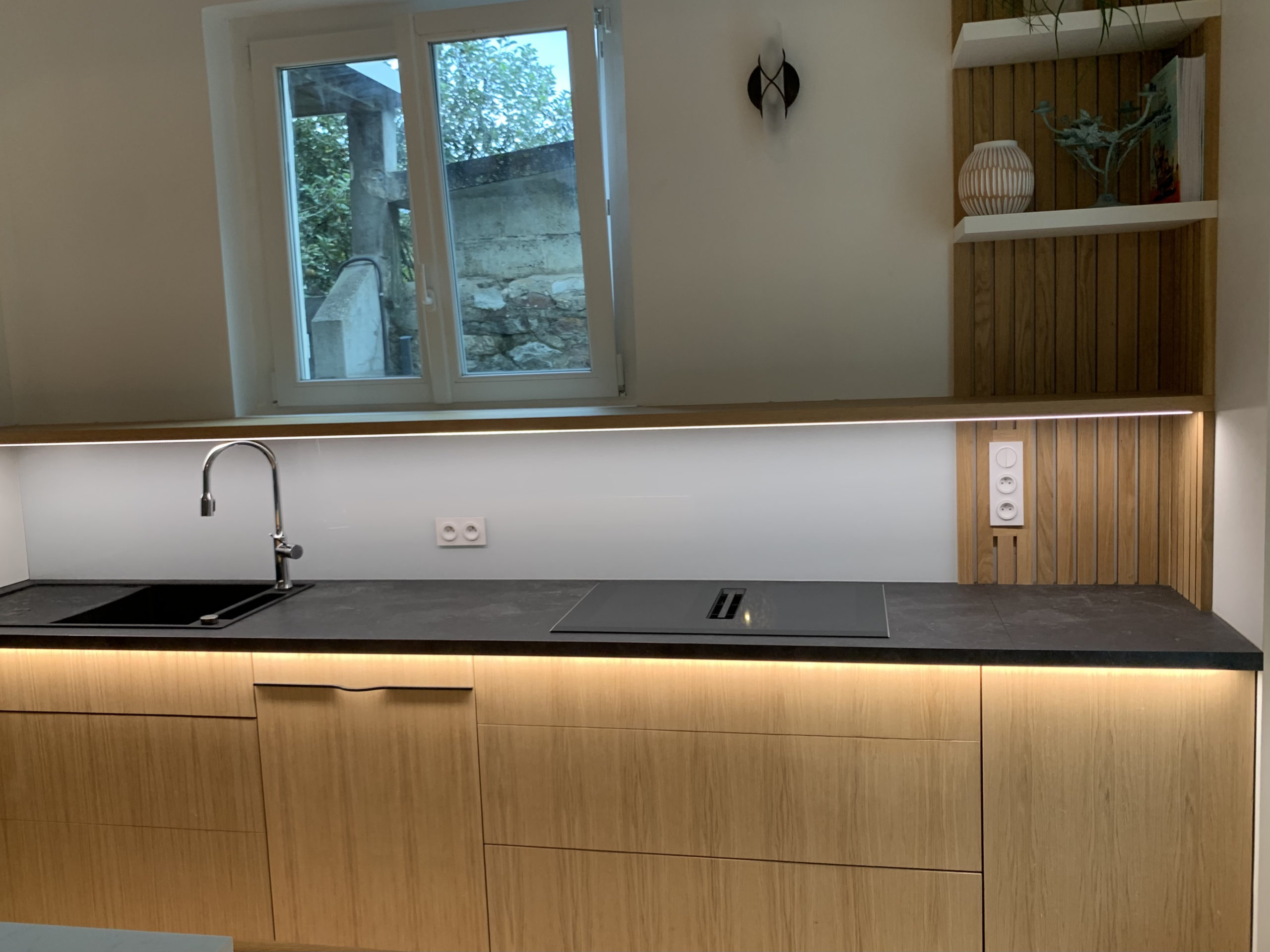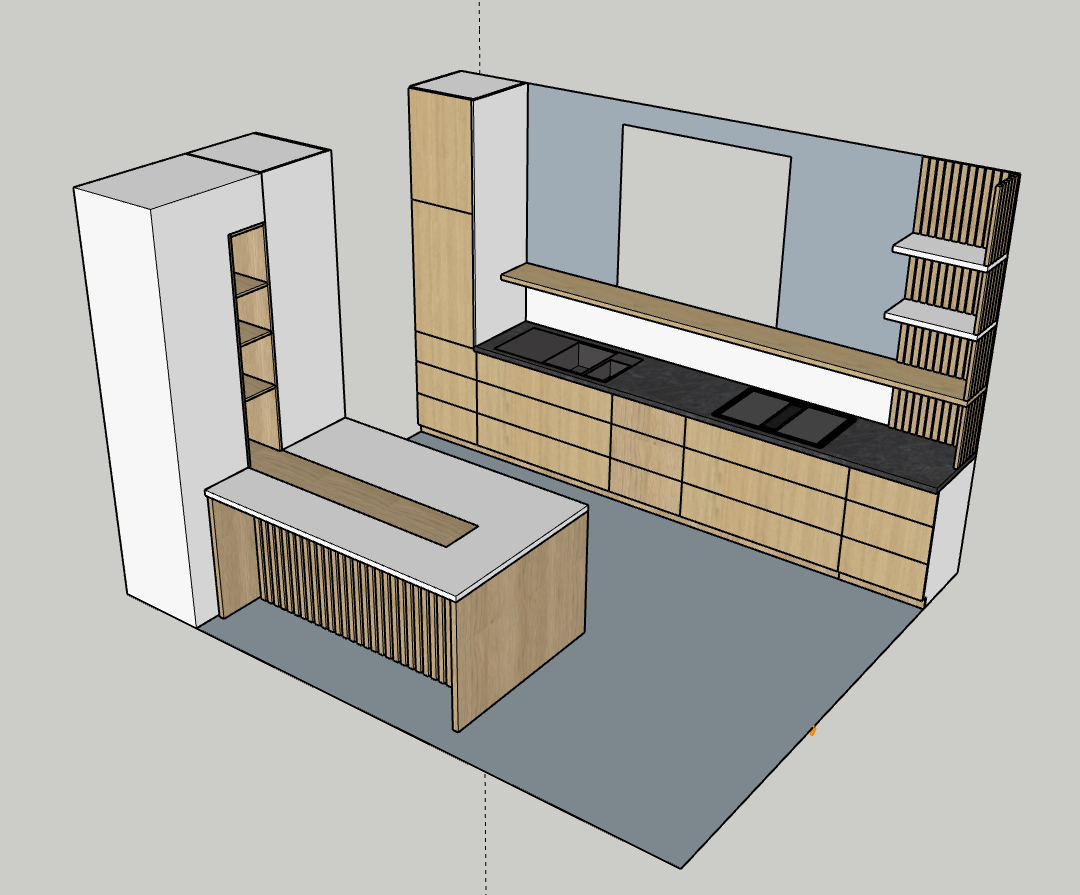 Conception de la cuisine en 3D en prenant soin de bien prendre en compte toutes les envies du client. Nous proposons un premier modèle que nous affinons ensuite avec lui. Il valide l’implantation, le choix des matériaux et des options de quincaillerie possible. Ensuite, nous avons conçu la cuisine en atelier. Pour cela, les caissons ont été fait en mélaminé noir, les portes en latté chêne huilé et le claustra en chêne massif huilé. Le plan de travail, quant à lui, a été fait en aggloméré hydro stratifié ainsi que l’étagère au dessus de l’évier pour la résistance à l’humidité.