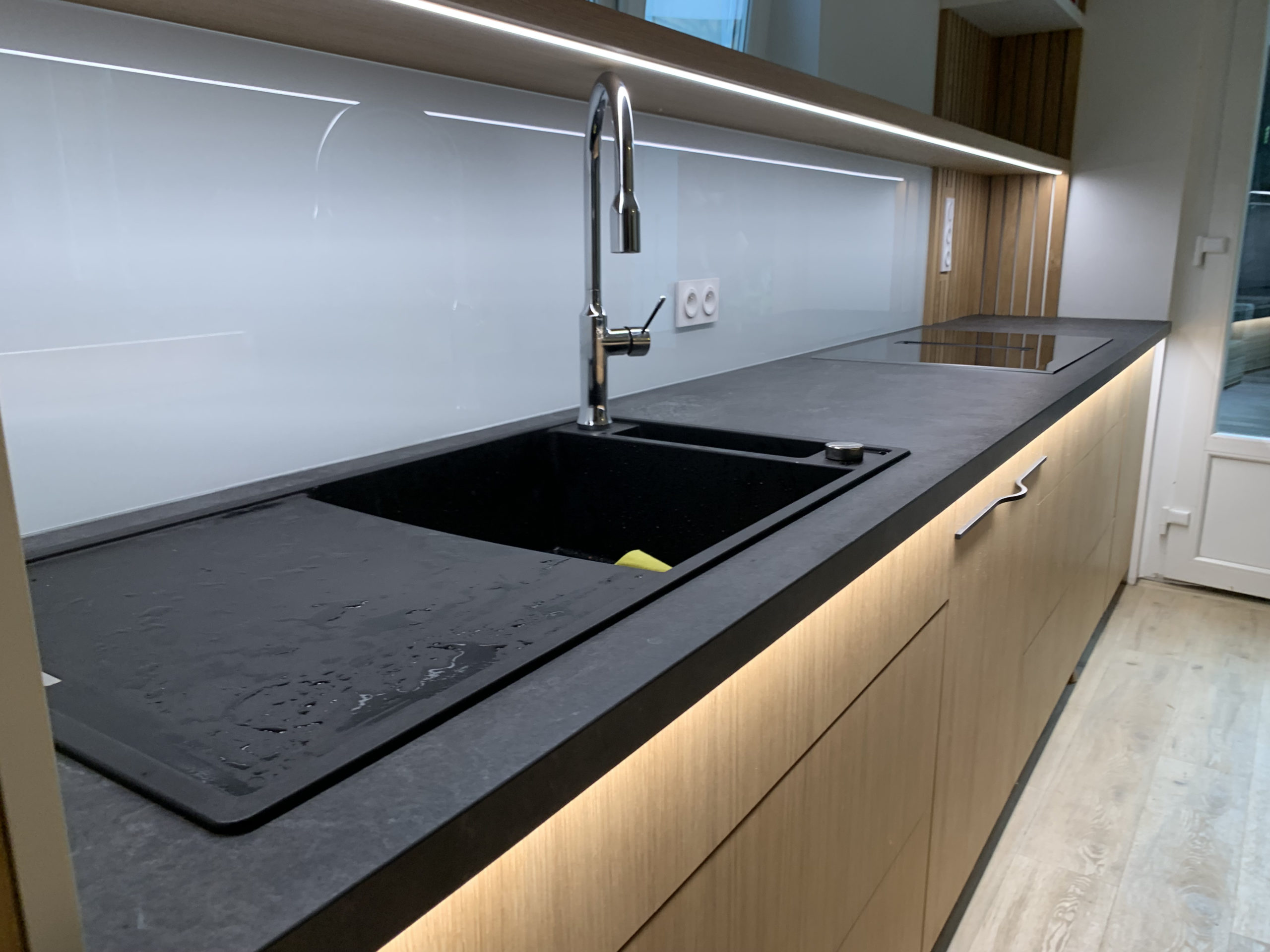 Par ailleurs, chaque tiroir est équipé d’une ouverture par pression et d’une fermeture avec amortisseur. Les portes s’ouvrent par pression également. Nous avons aussi conçu la porte qui mène au cellier : choix d’une porte coulissante avec système de rail invisible. Les joues de finition sont en stratifié blanc extra mat. Pour parfaire l’ensemble, nous avons posé une crédence en verre sécurit filmé blanc, qui a l’avantage d’être facile d’entretien.