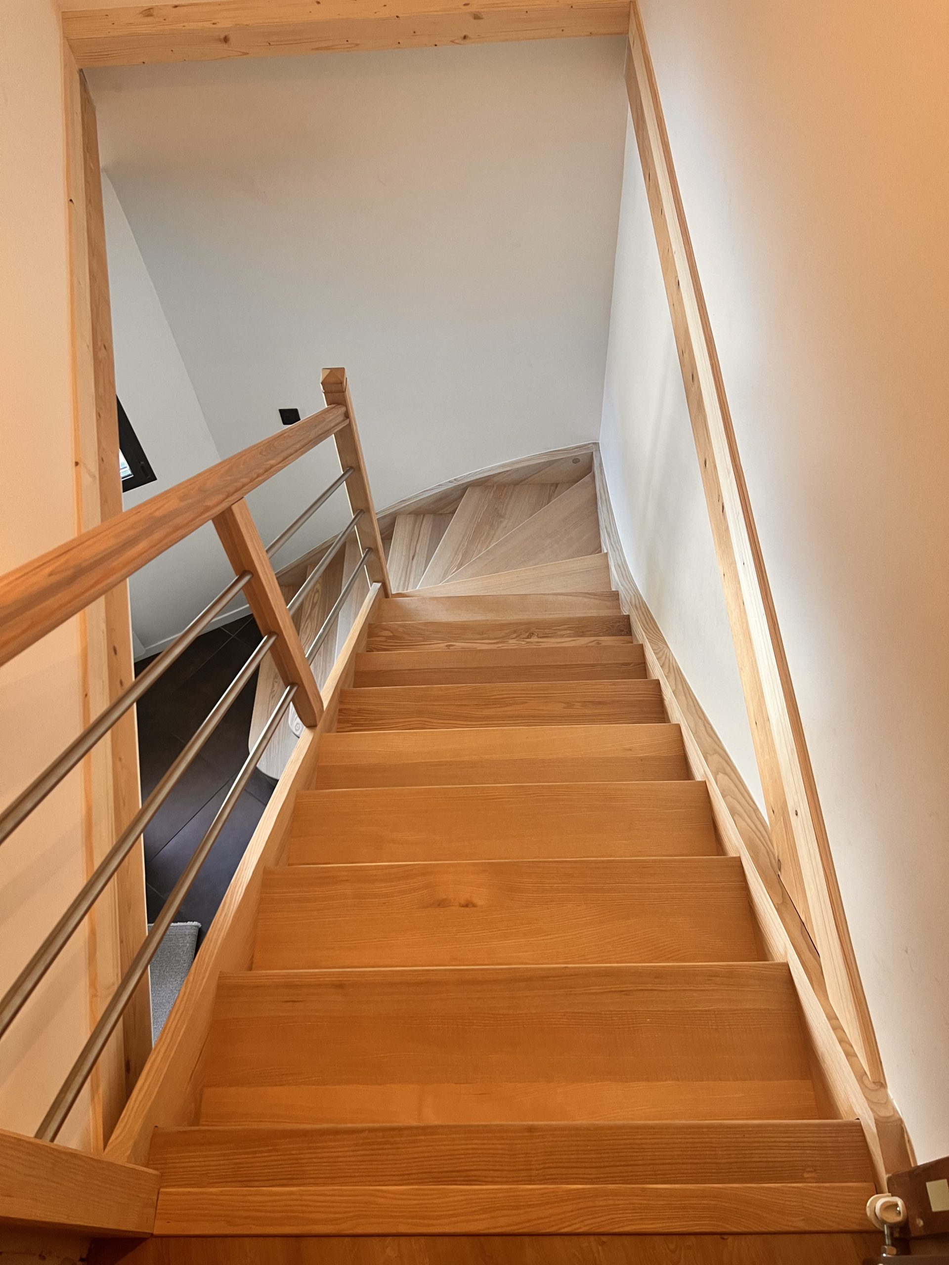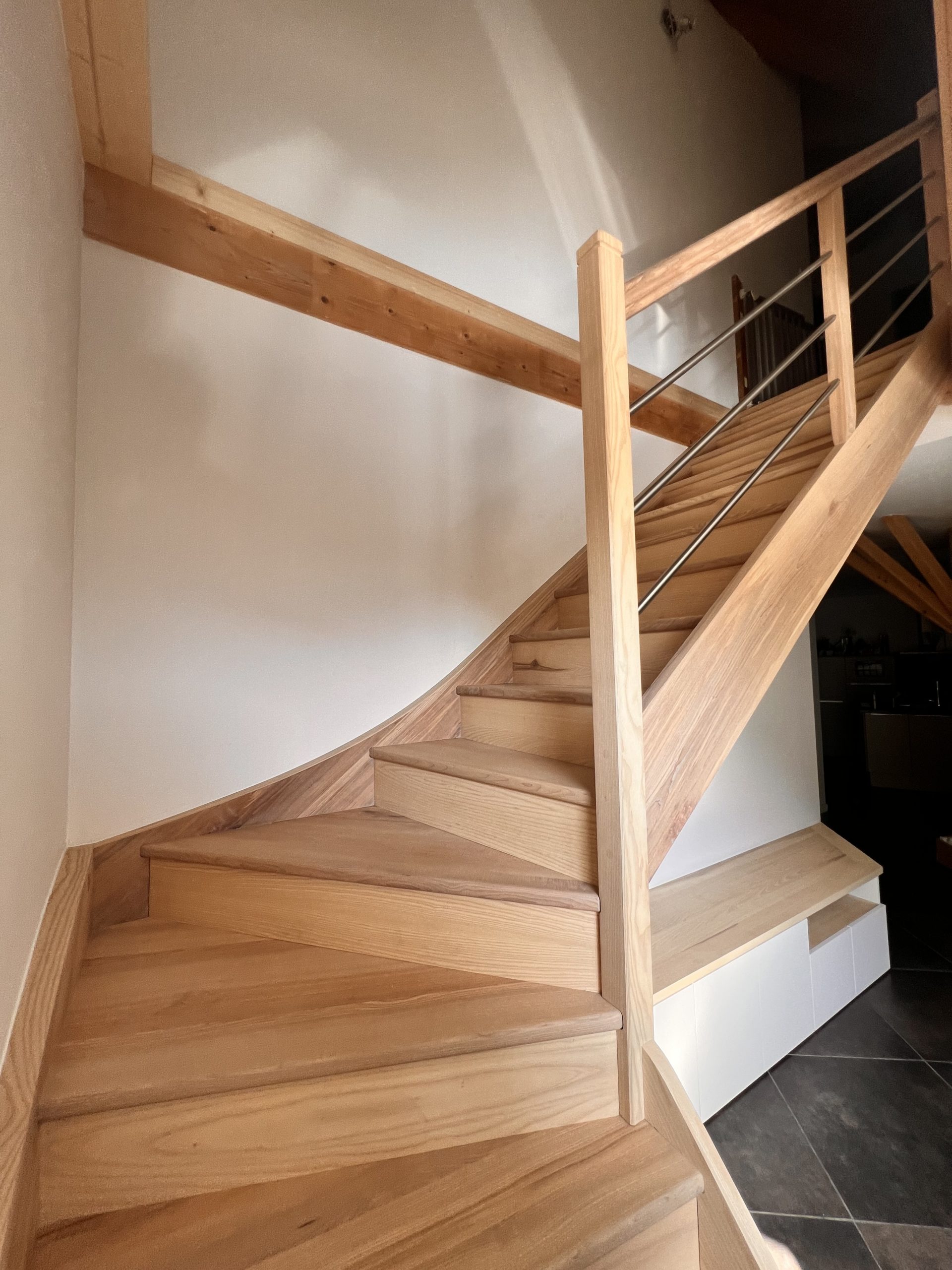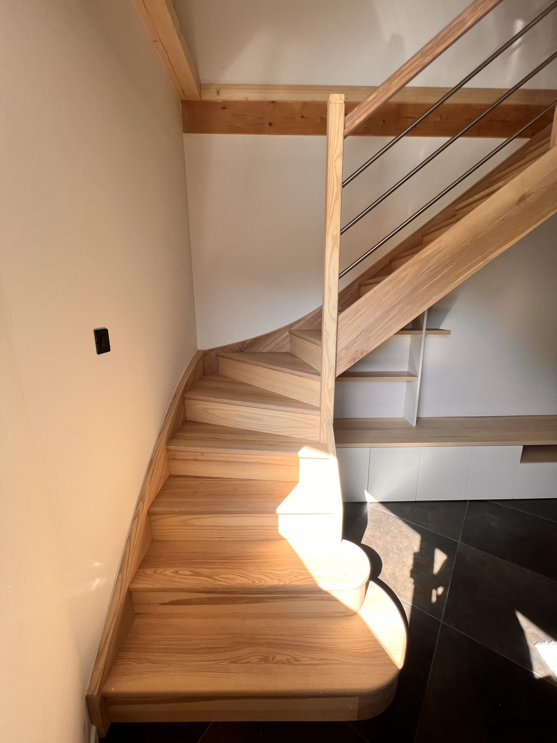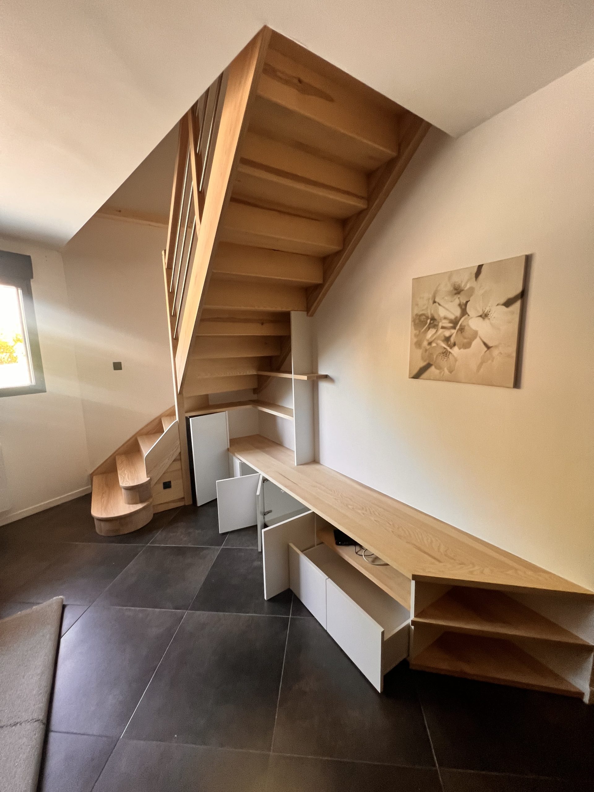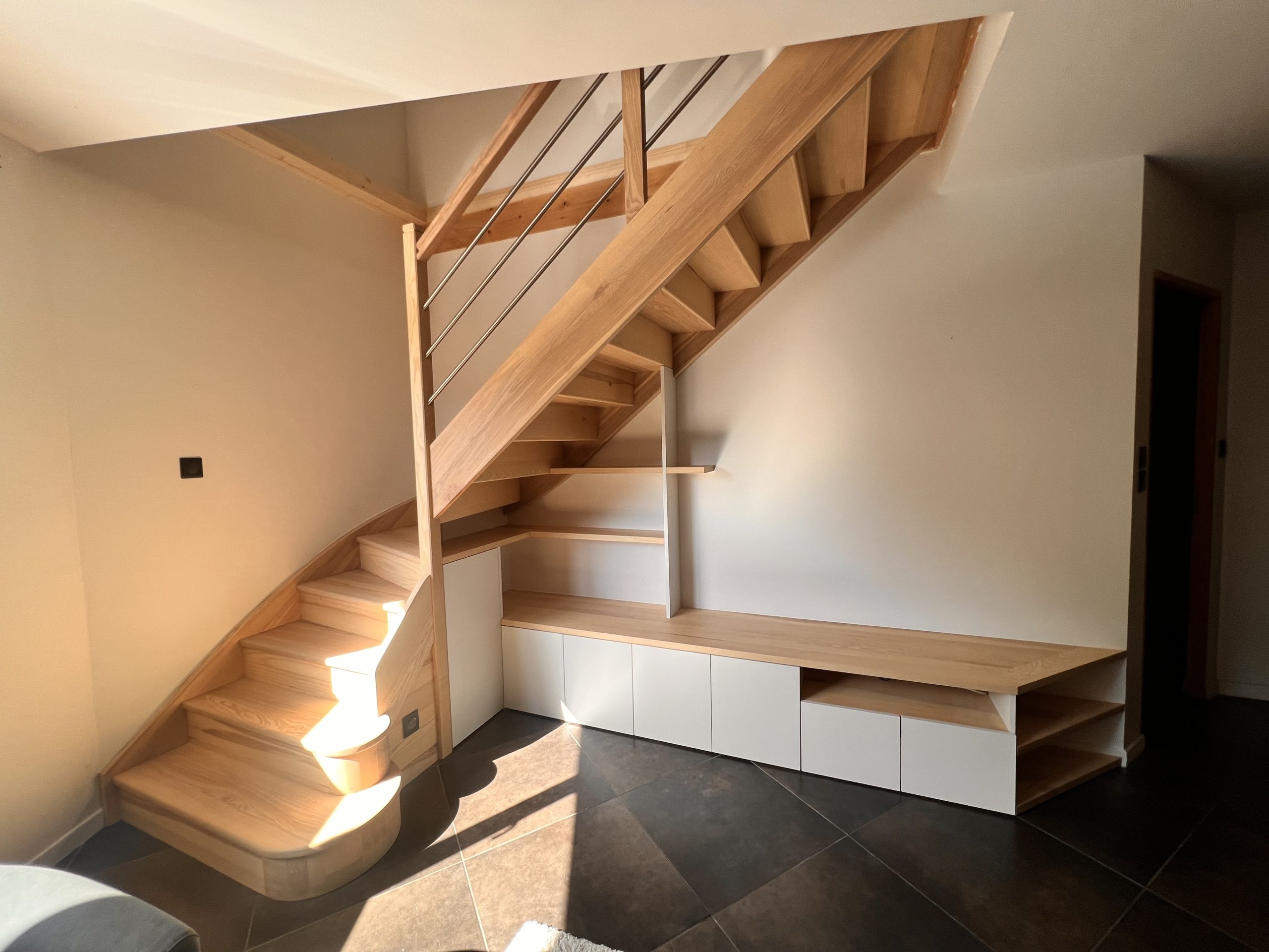 Agencement, fabrication et installation d’un escalier et d’un meuble TV sur mesure en frêne olivier et en mélaniné blanc. Les clients souhaitaient optimiser l’espace sous l’escalier pour y intégrer du rangement et un meuble TV. Afin du sublimé le client à opté pour une finition huilé naturel de notre partenaire Rubio.
