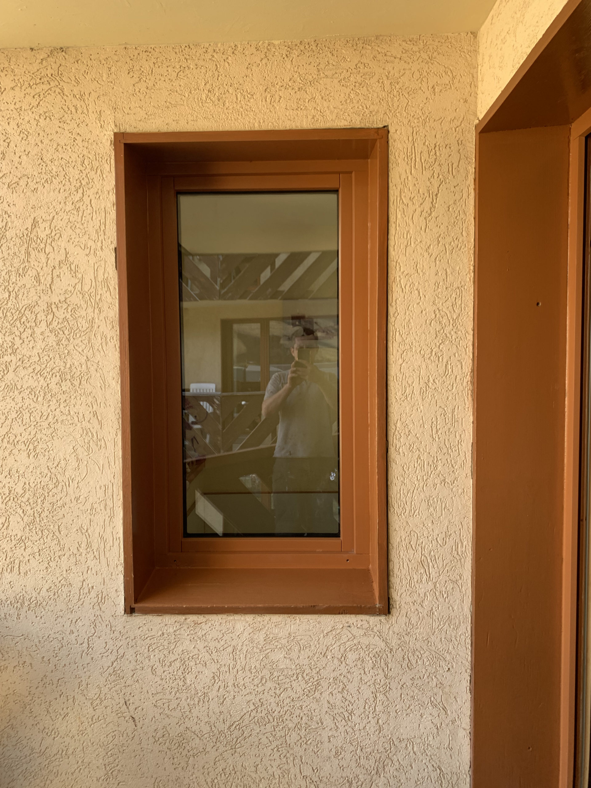 Dépose complète de la fenêtre existante, puis installation de la nouvelle fenêtre en bois faite sur-mesure. L’extérieur de la fenêtre ainsi que son habillage existant ont été protégés par une peinture colorée.