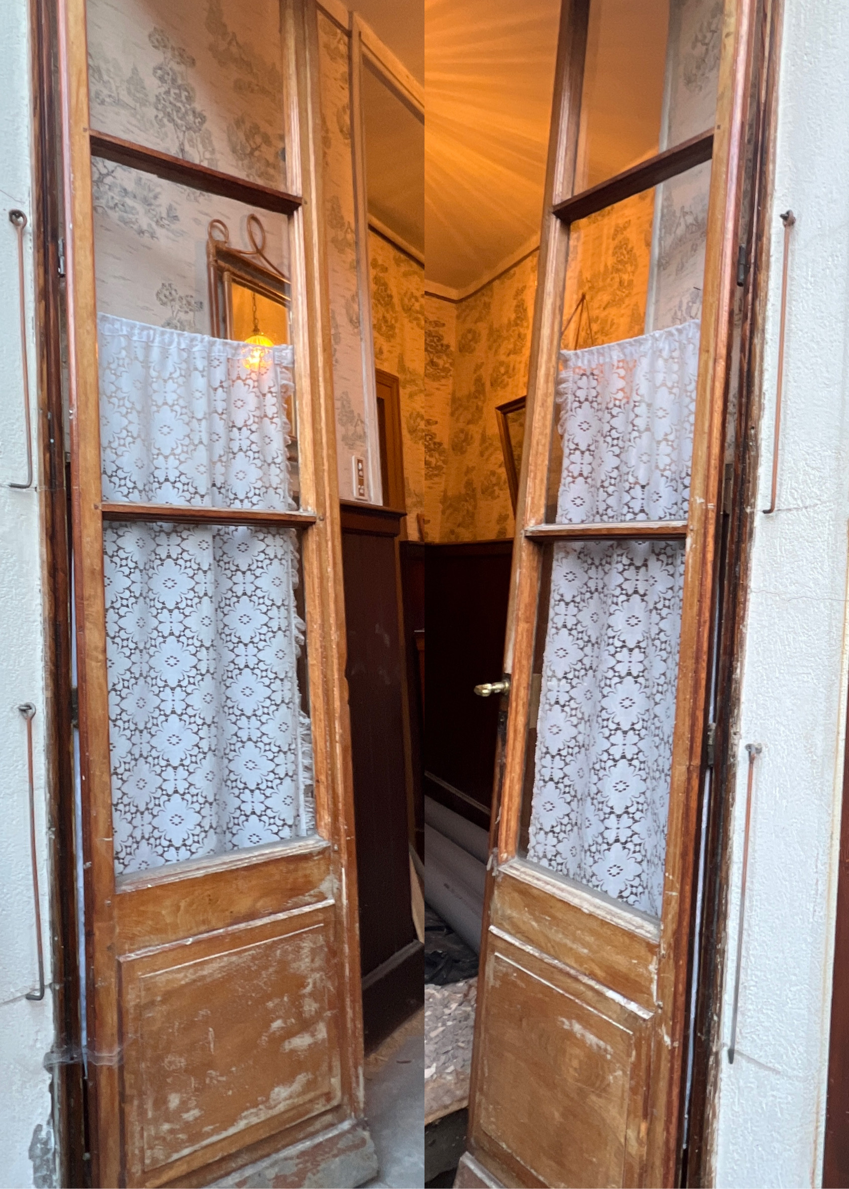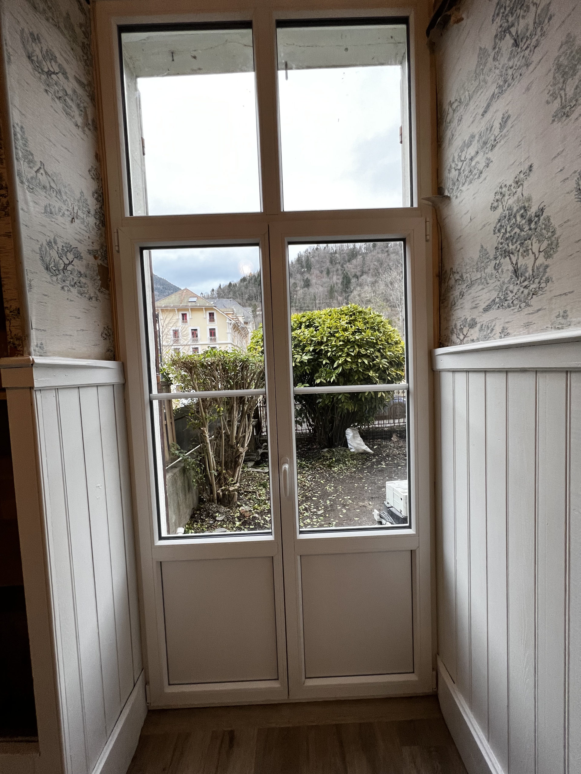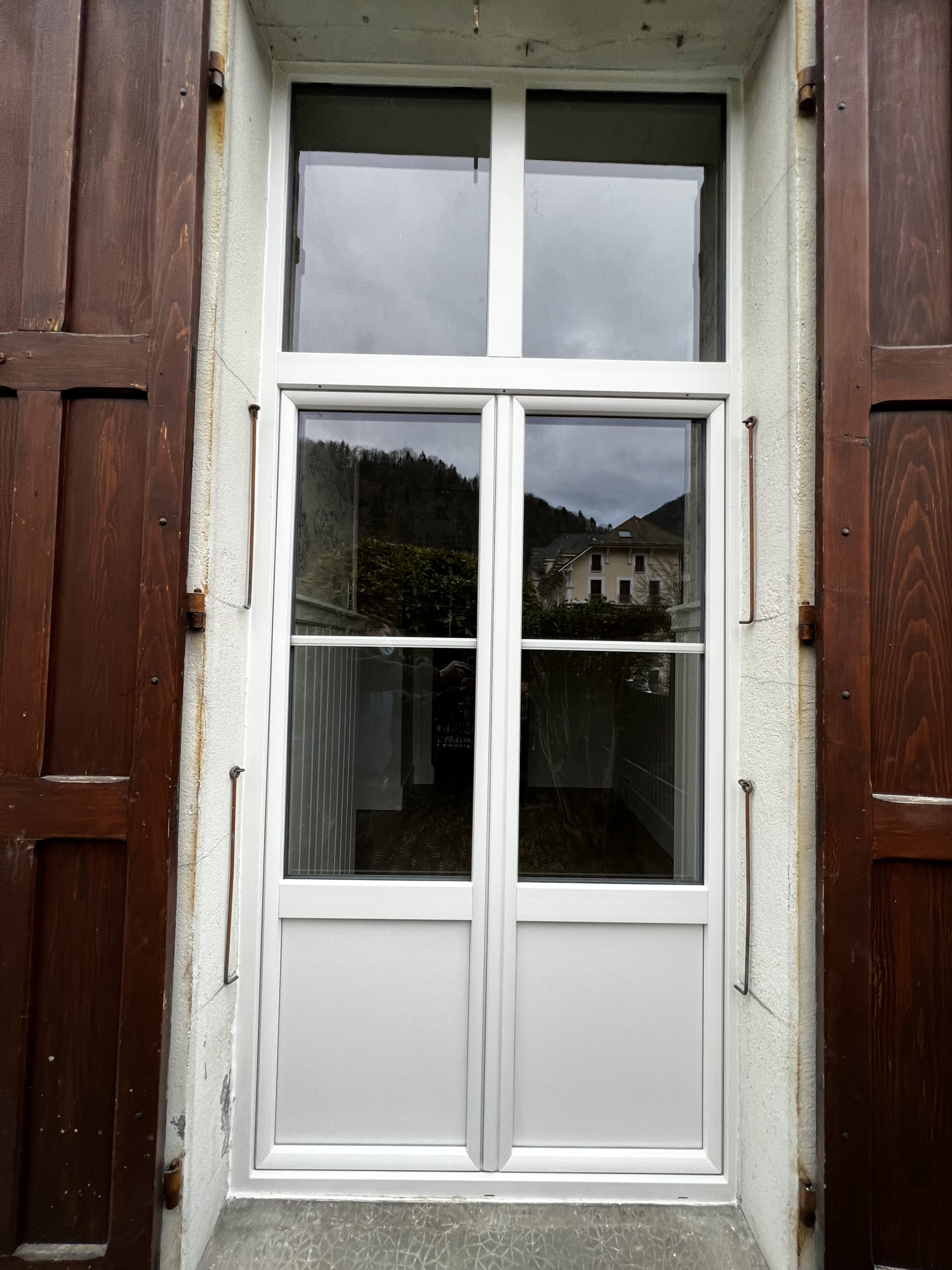 Remplacement de la porte fenêtre complète, ce qui comprend le bâti et les ouvrants. Les clients ont choisi une porte fenêtre en PVC avec de petits bois incrustés dans le verre pour différentes raisons : pour l’esthétique et pour la facilité d’entretien. Nous avons également opté pour un imposte afin de réduire la taille de l’ouvrant.