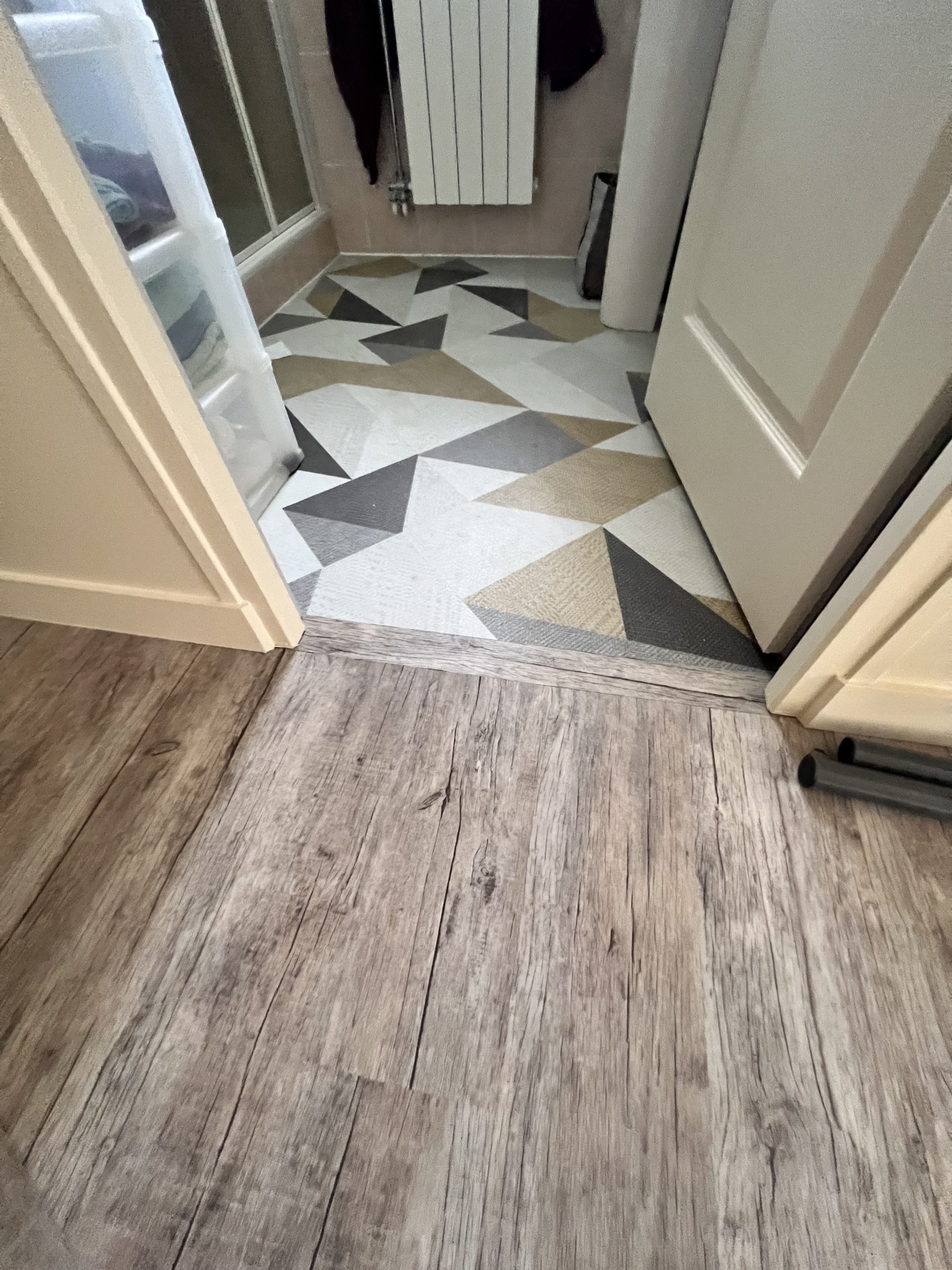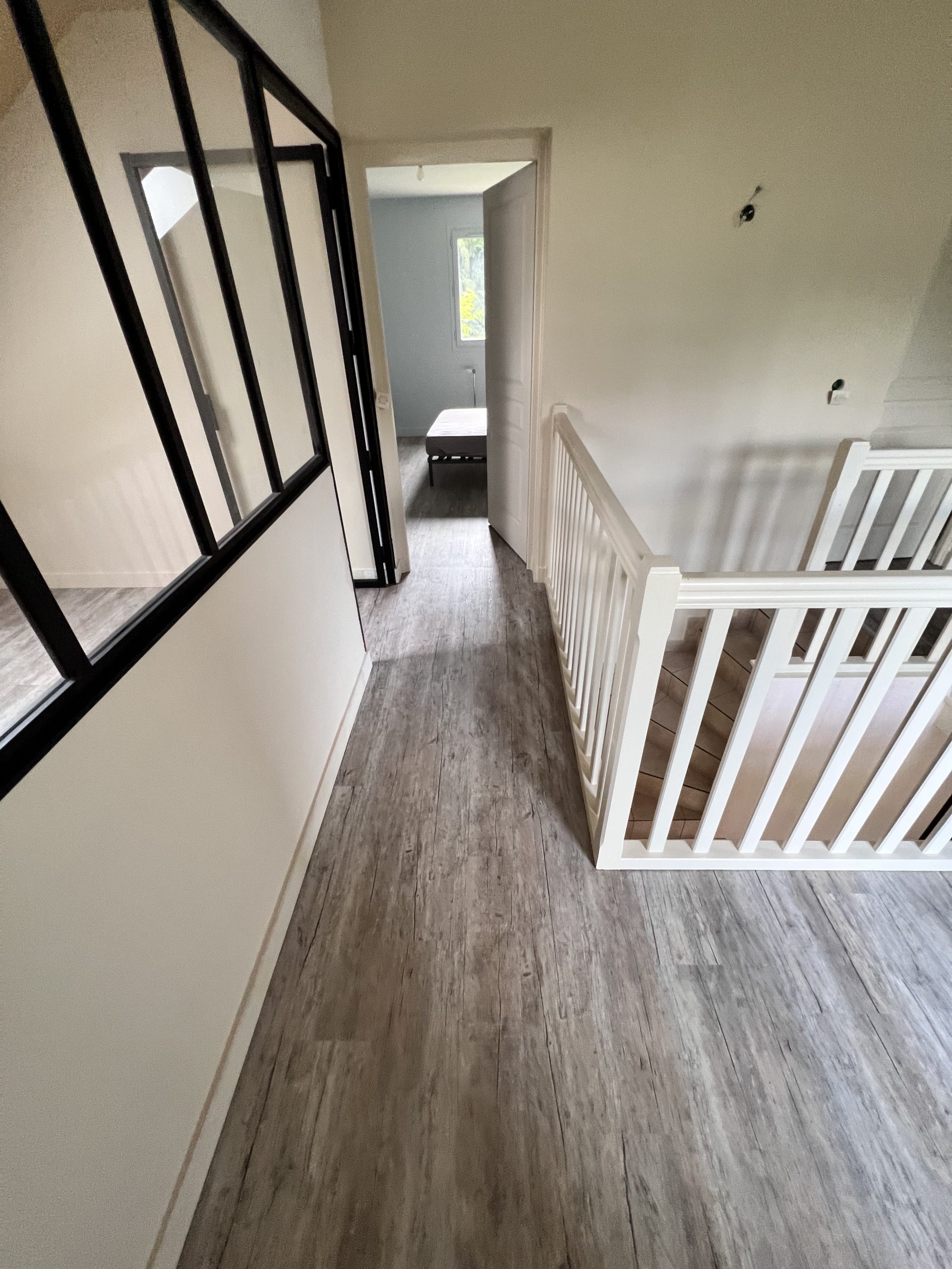 Après avoir refait un ragréage fibré, nous avons fourni et collé un sol vinyle décor bois et contemporain. De plus, nous avons installé des plinthes en médium prêtes à peindre par le client.