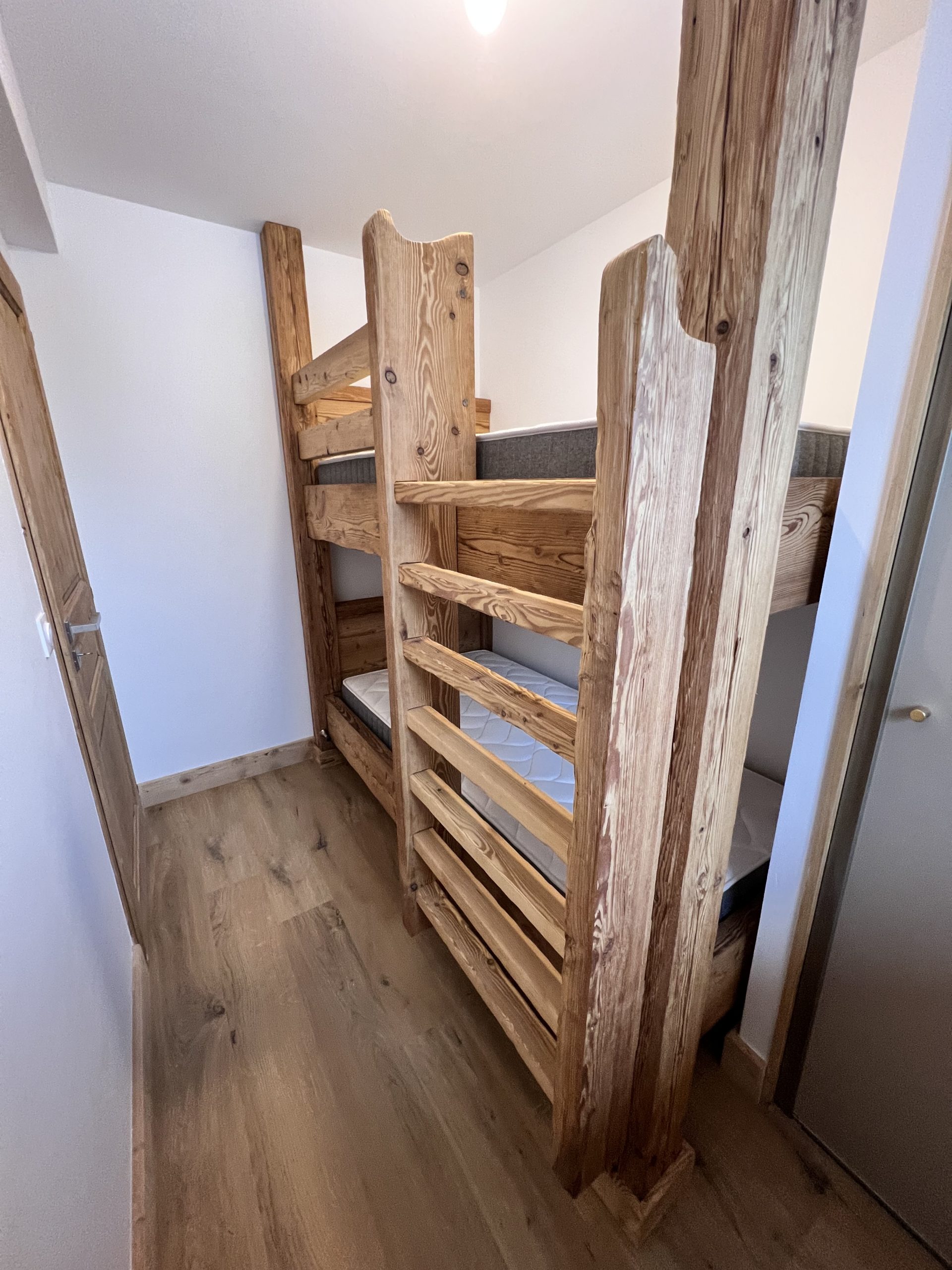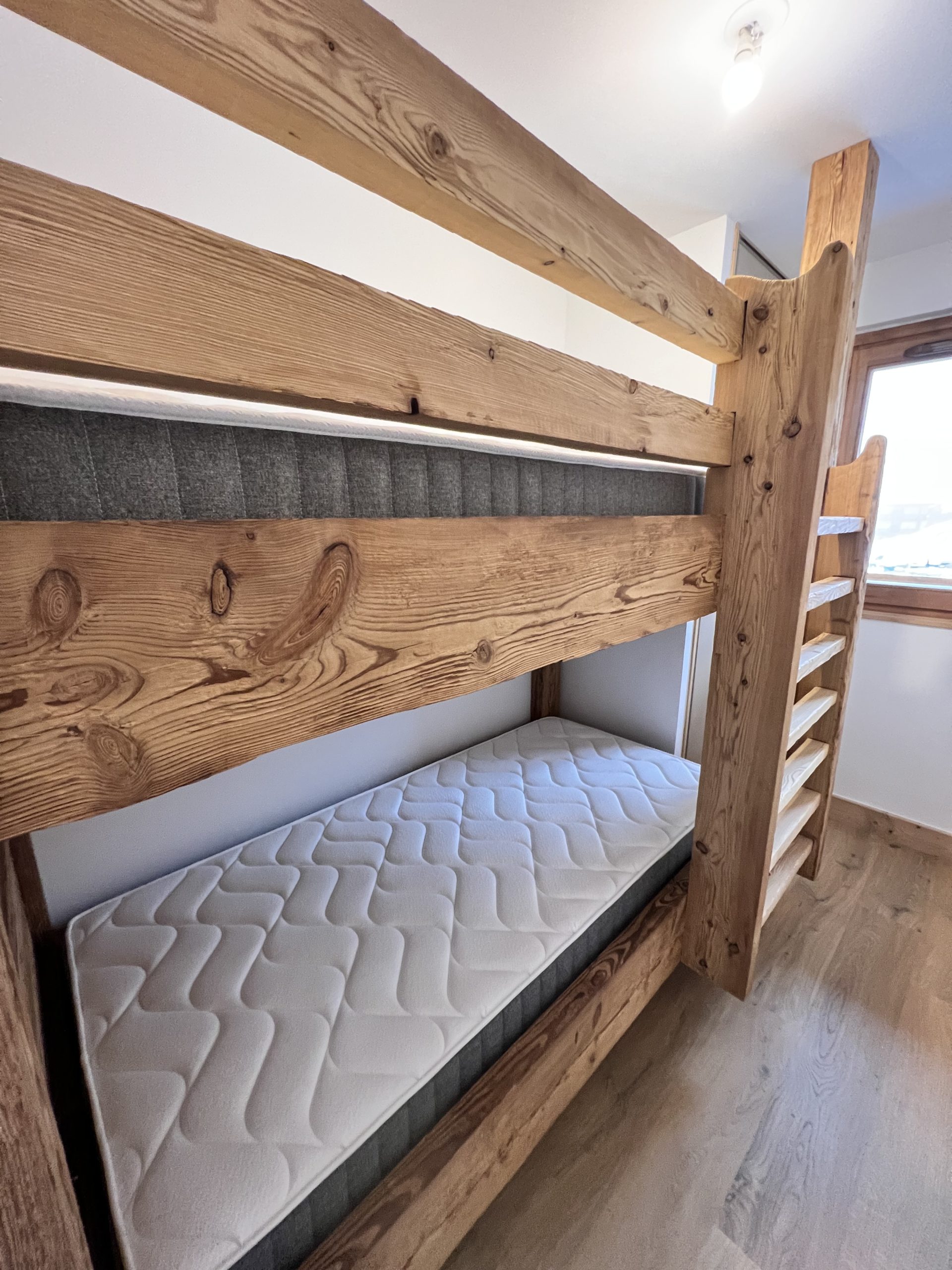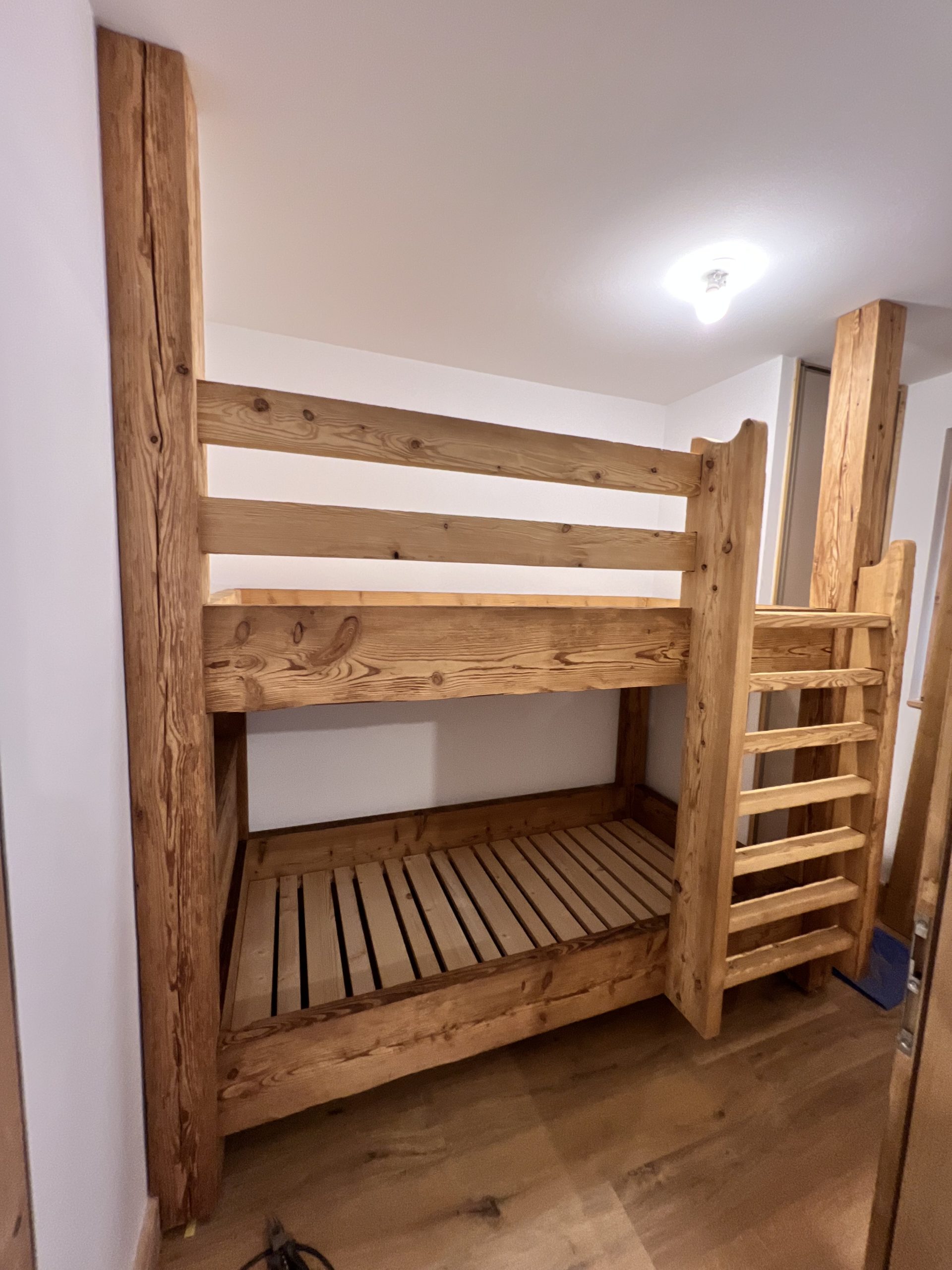 Nous avons créé et installé des lits superposés sur mesure qui s’intègrent parfaitement à l’espace défini. Pour cela, nous avons choisi un mélèze thermotraité brossé éclaté, afin de donner un aspect chalet savoyard à la chambre.