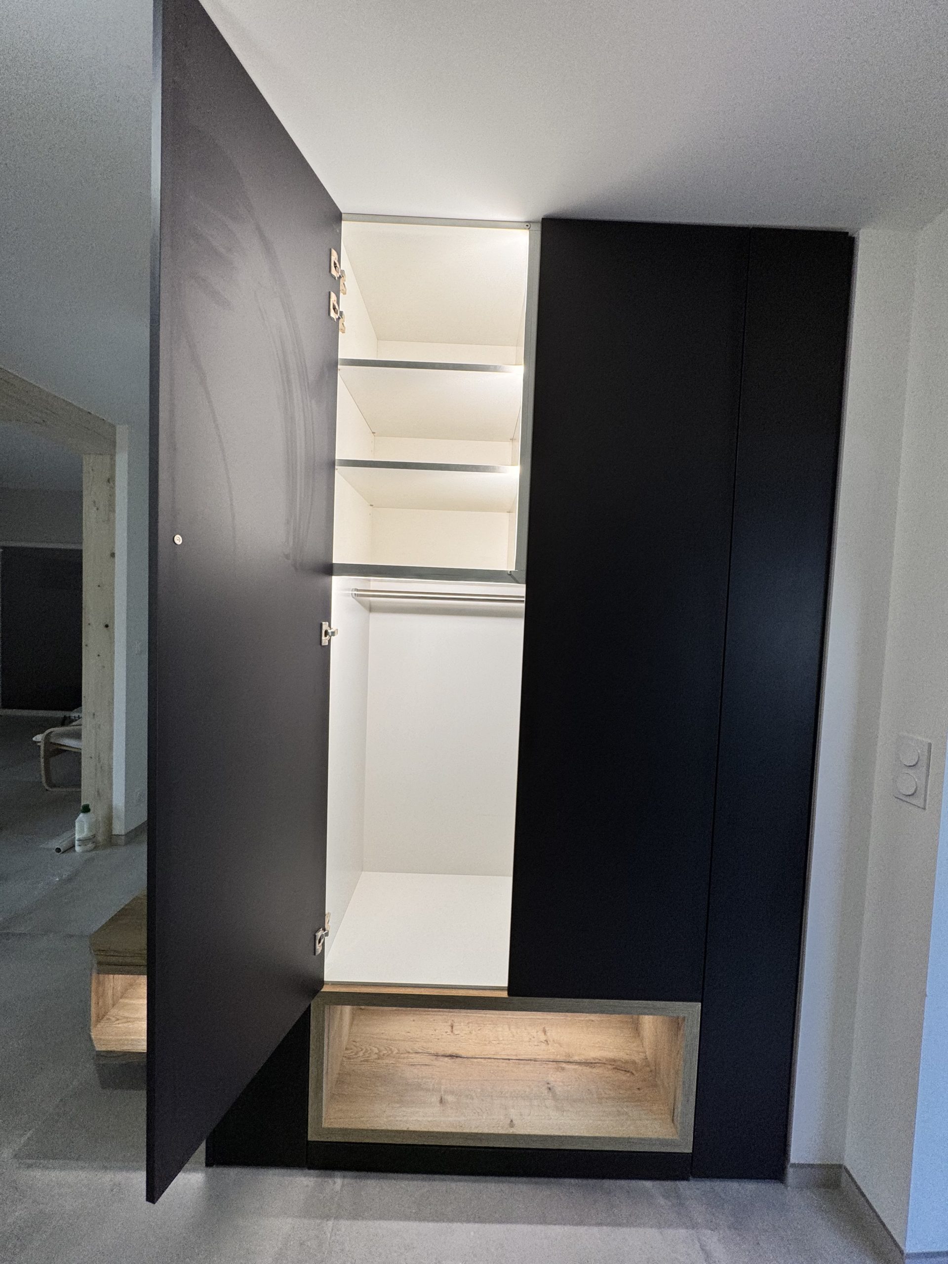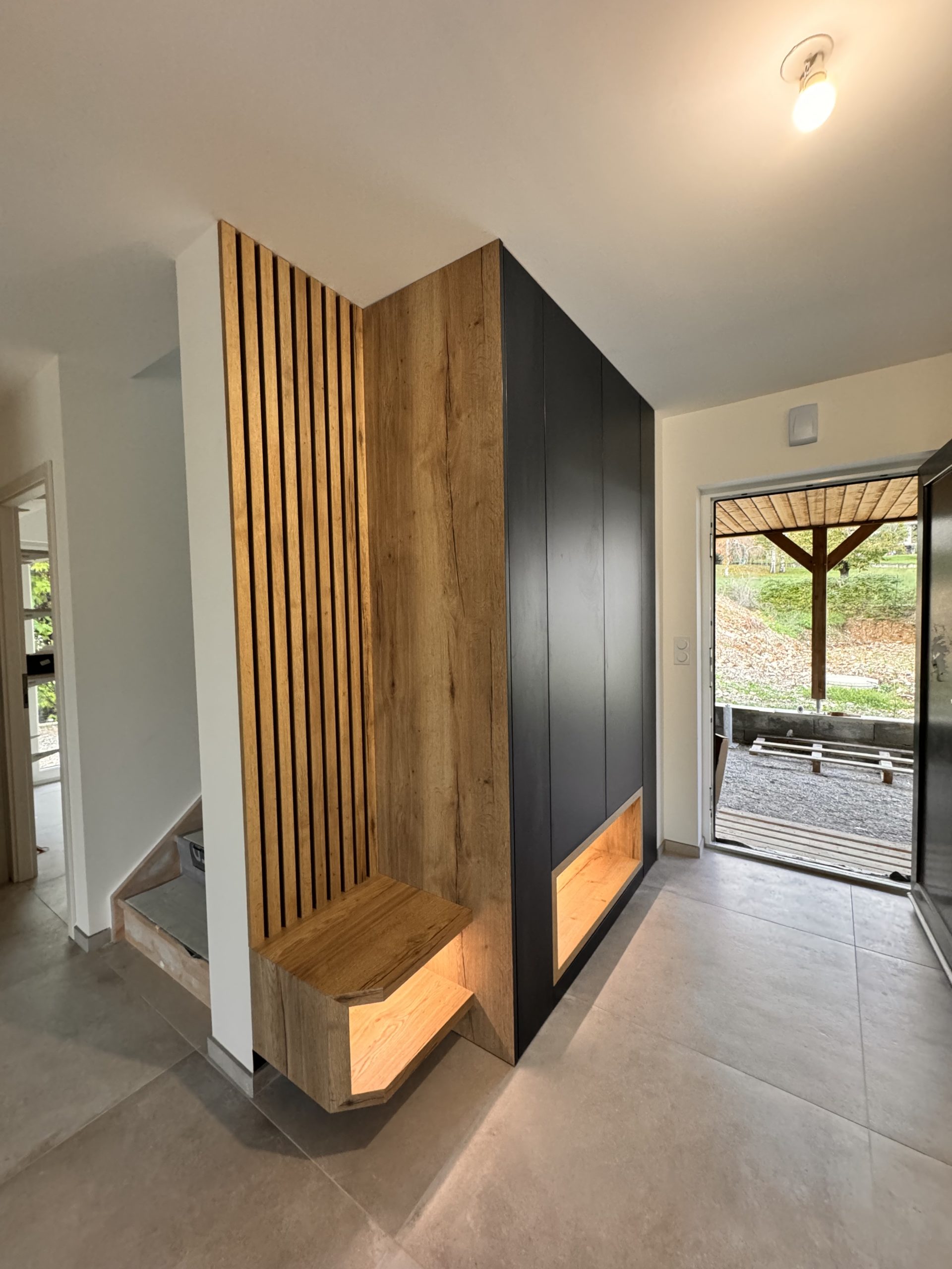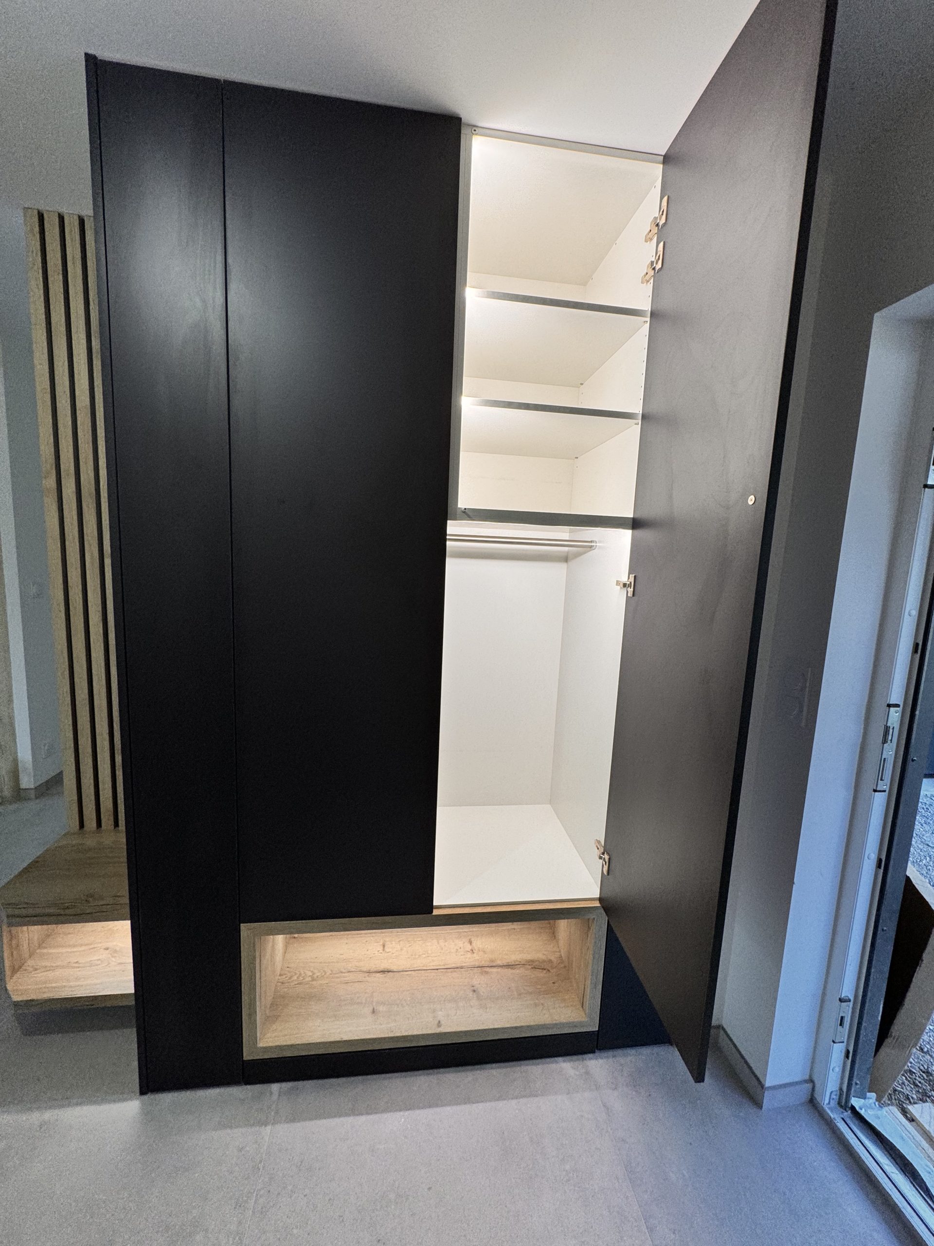 Conception, fabrication et installation d’un meuble d’entrée en mélaniné imitation bois et bleu. Ce meuble contient des led qui s’allument automatiquement à chaque ouverture de placard. De plus, il se compose d’étagères et de penderies. Par ailleurs, des niches ont été conçues sur le bas.