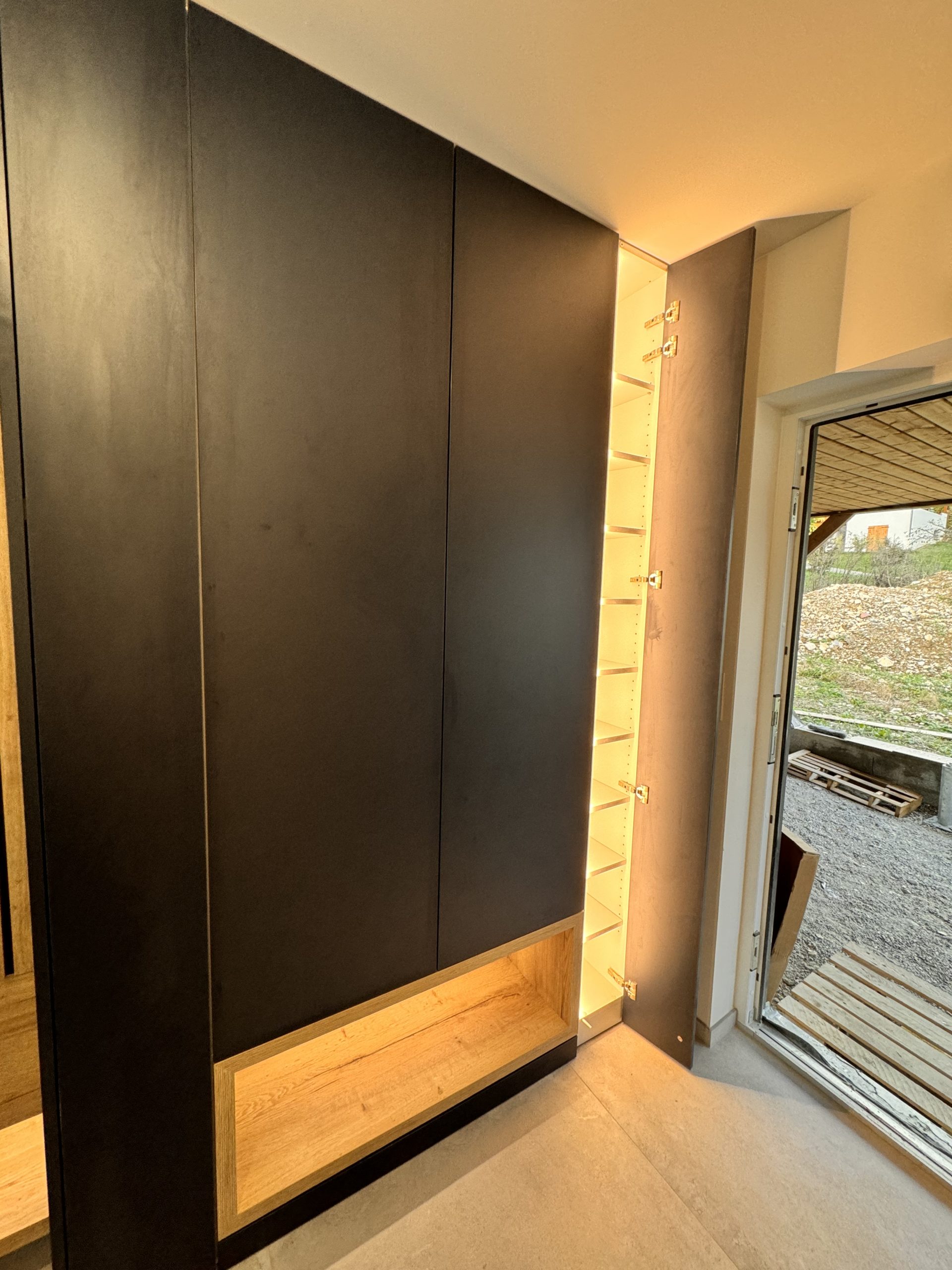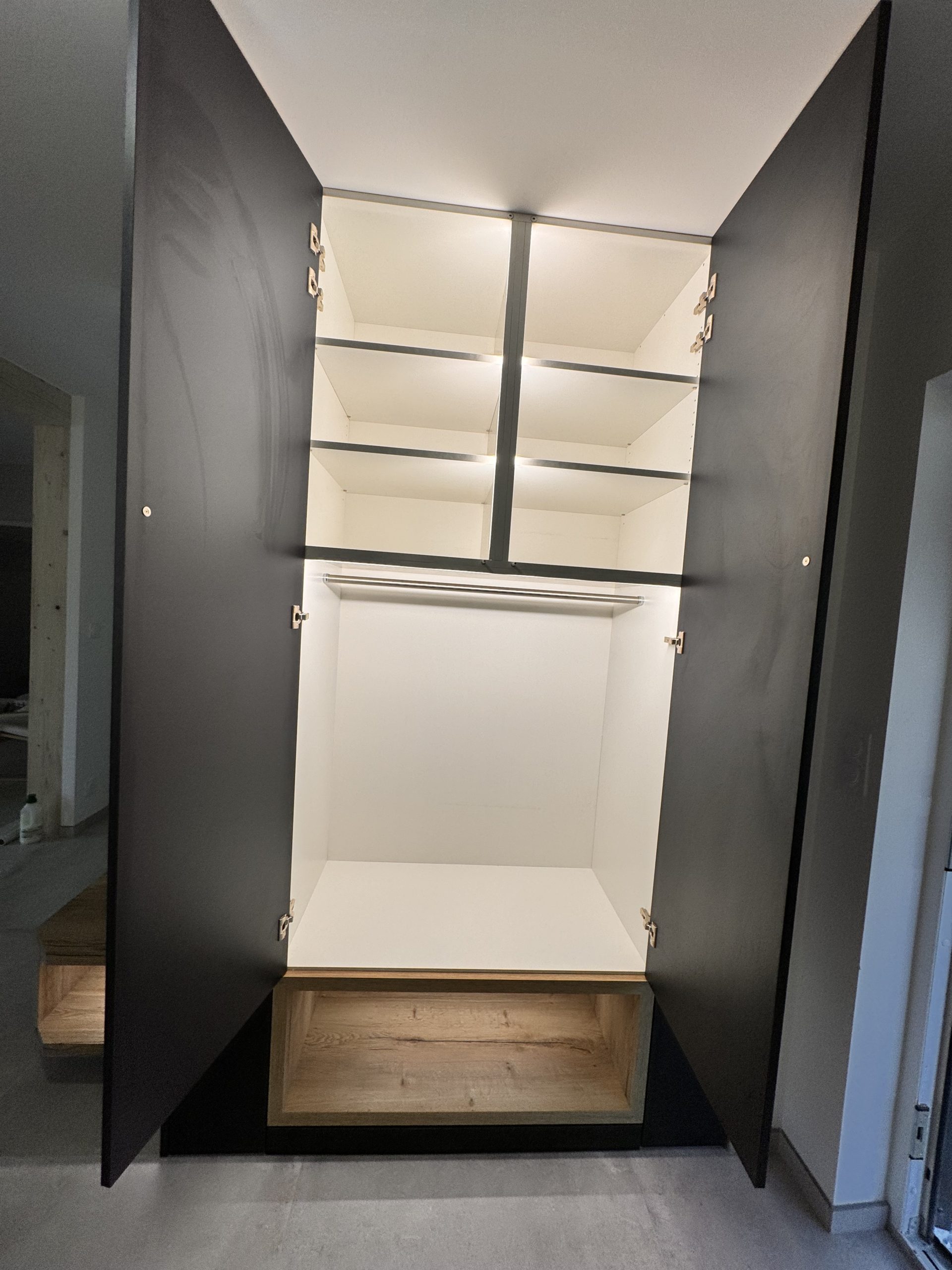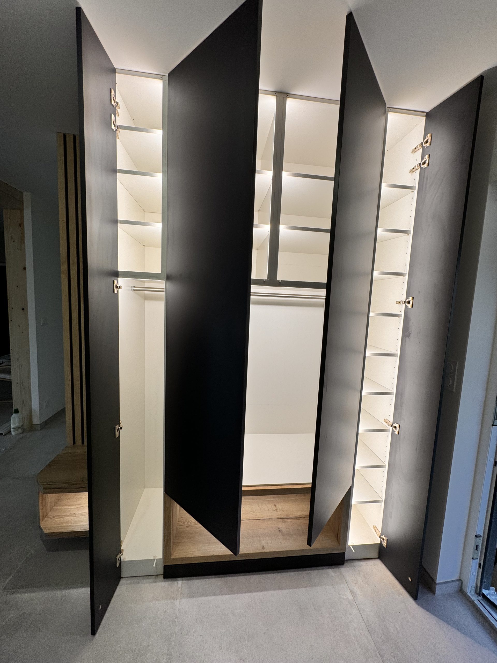 Conception, fabrication et installation d’un meuble d’entrée en mélaniné imitation bois et bleu. Ce meuble contient des led qui s’allument automatiquement à chaque ouverture de placard. De plus, il se compose d’étagères et de penderies. Par ailleurs, des niches ont été conçues sur le bas.