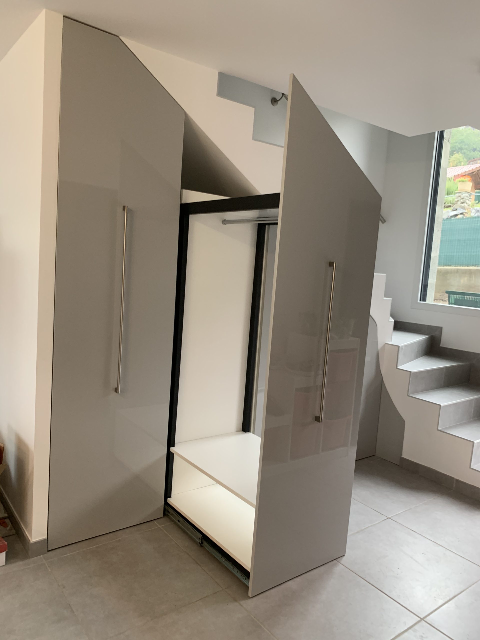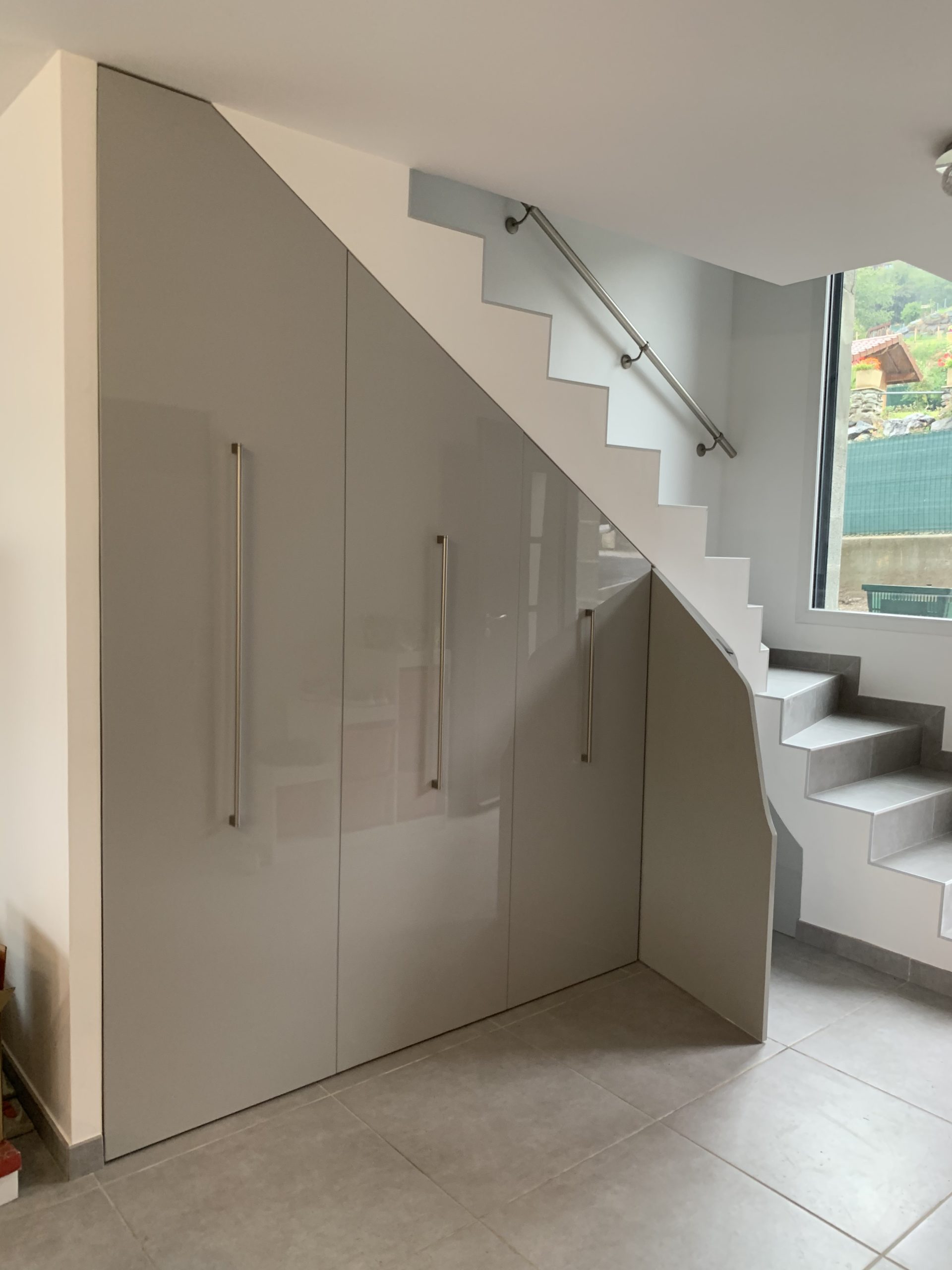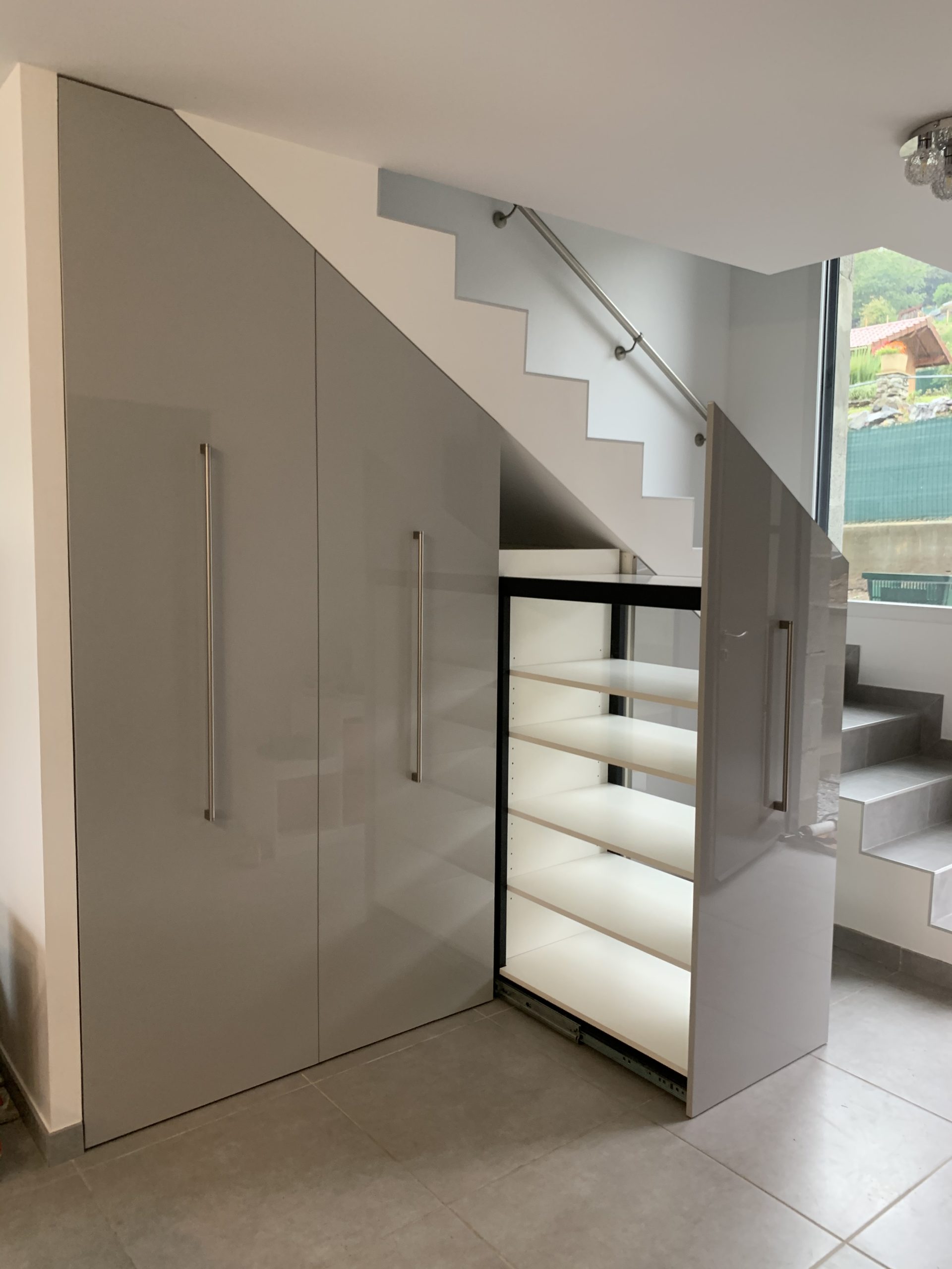 Nous avons conçu et fabriqué ce meuble sous escalier sur-mesure. Les clients souhaitaient optimiser l’espace sous l’escalier pour y créer du rangement. Nous avons donc convenu d’y faire trois grands tiroirs : deux pour les penderies et un pour des étagères. Le quatrième est une porte qui laisse place à un rangement à chaussures. La structure des tiroirs est en acier, les caissons en mélaminé blanc et les portes sont en mélaminé gris brillant. Par ailleurs, les tiroirs font toute la largeur de l’escalier, c’est à dire 90cm.