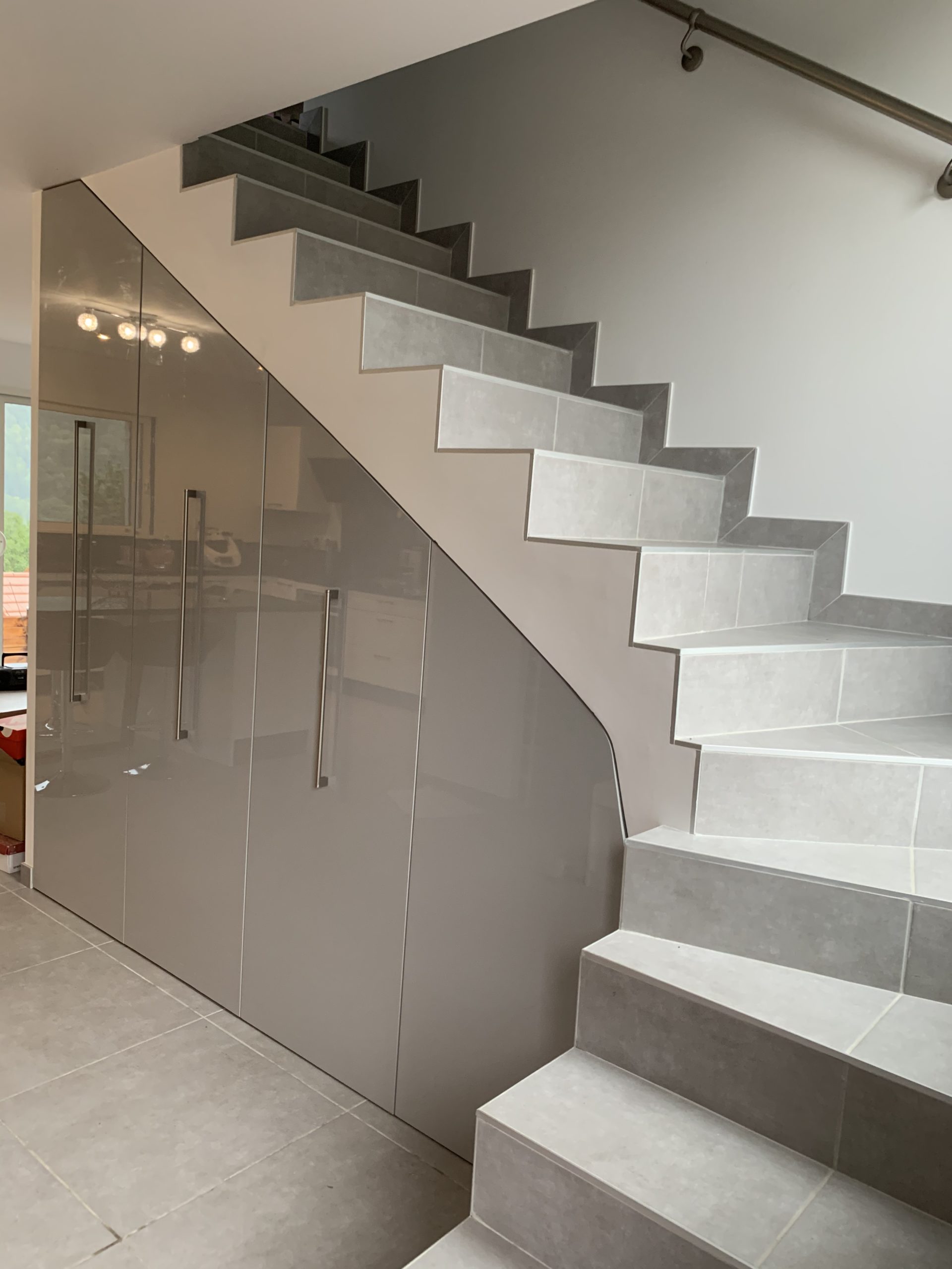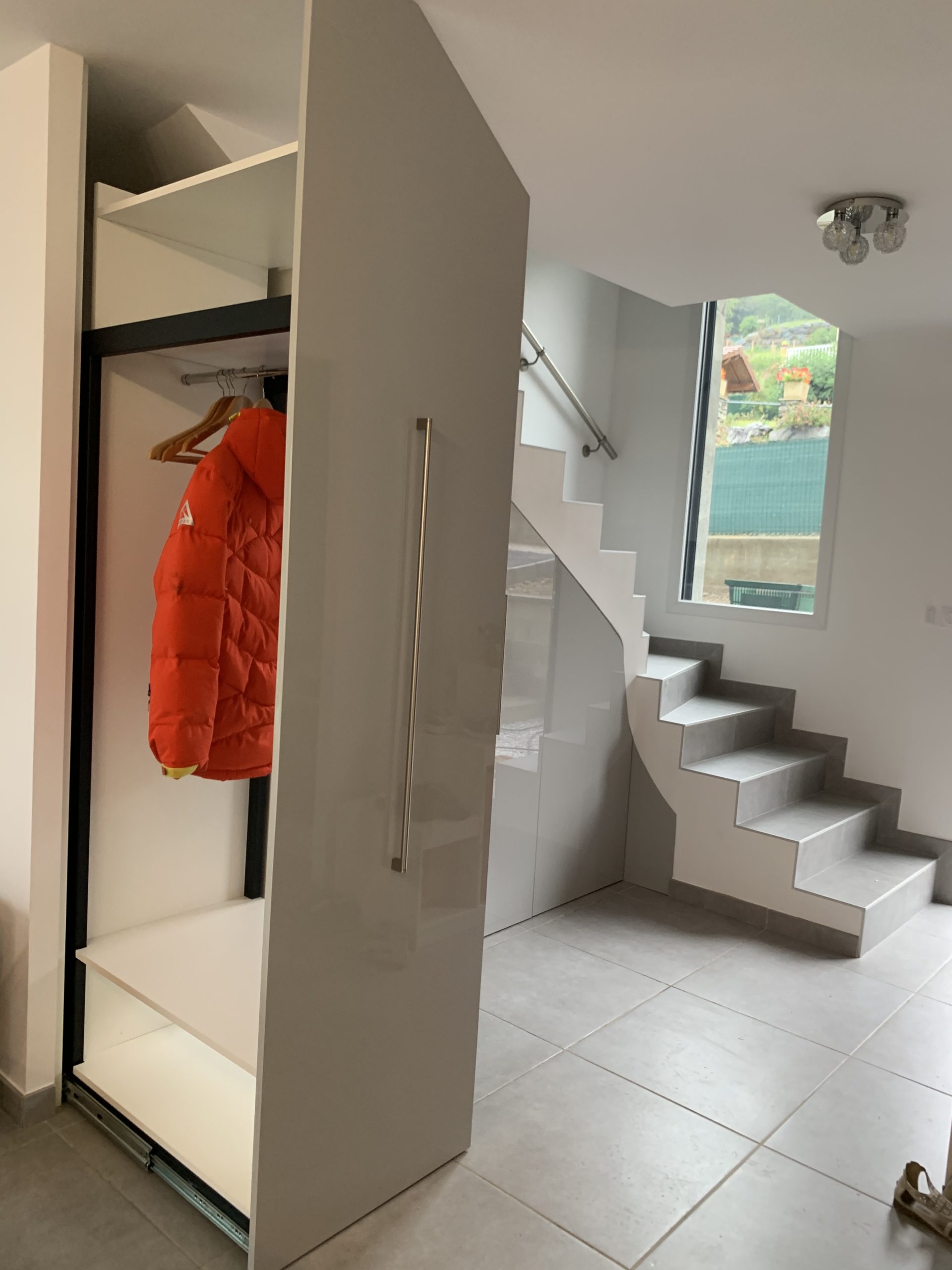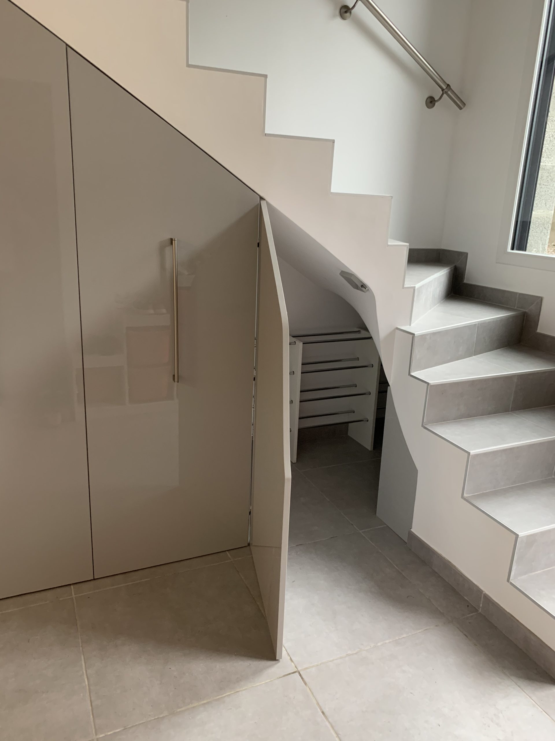 Nous avons conçu et fabriqué ce meuble sous escalier sur-mesure. Les clients souhaitaient optimiser l’espace sous l’escalier pour y créer du rangement. Nous avons donc convenu d’y faire trois grands tiroirs : deux pour les penderies et un pour des étagères. Le quatrième est une porte qui laisse place à un rangement à chaussures. La structure des tiroirs est en acier, les caissons en mélaminé blanc et les portes sont en mélaminé gris brillant. Par ailleurs, les tiroirs font toute la largeur de l’escalier, c’est à dire 90cm.