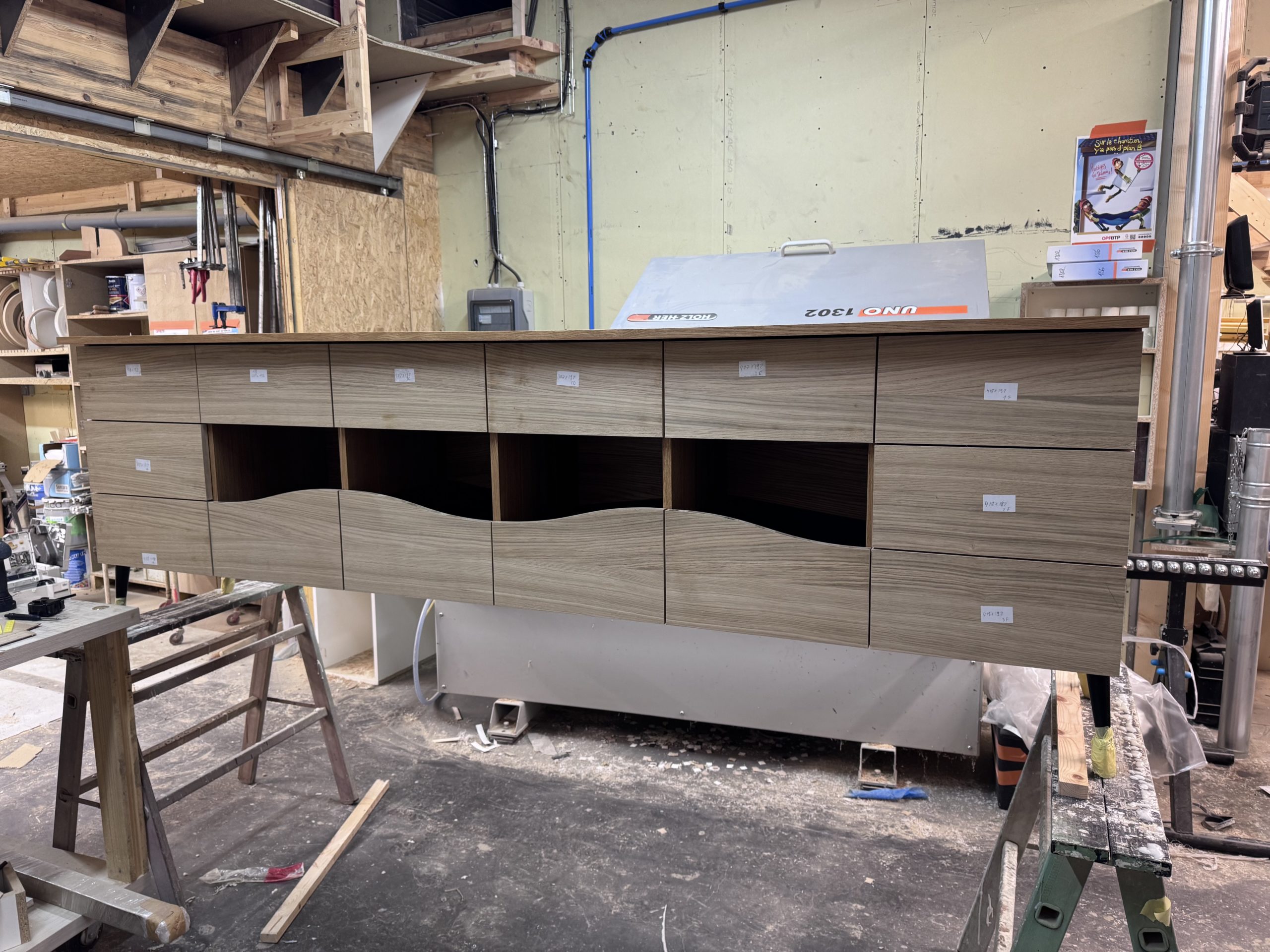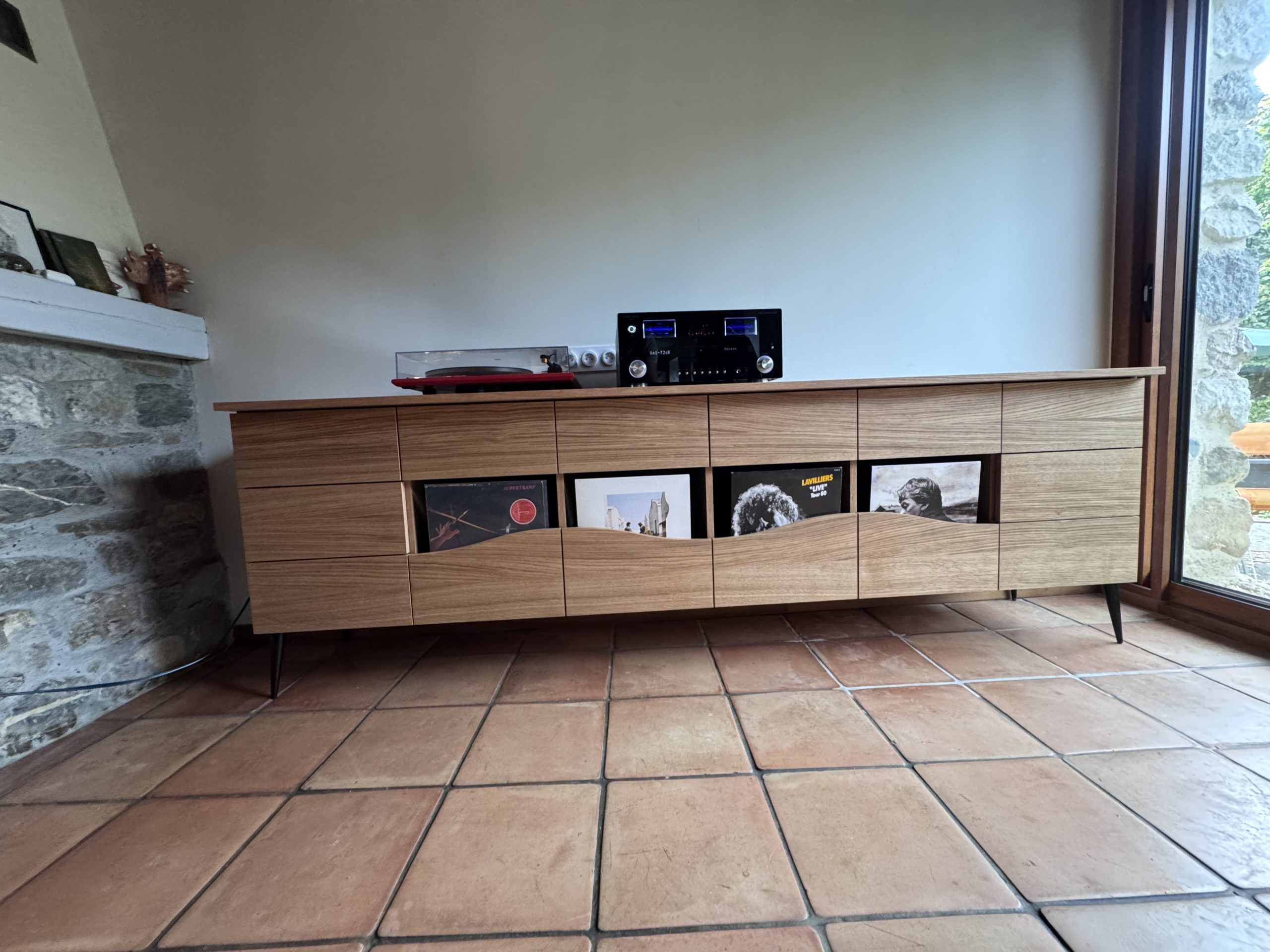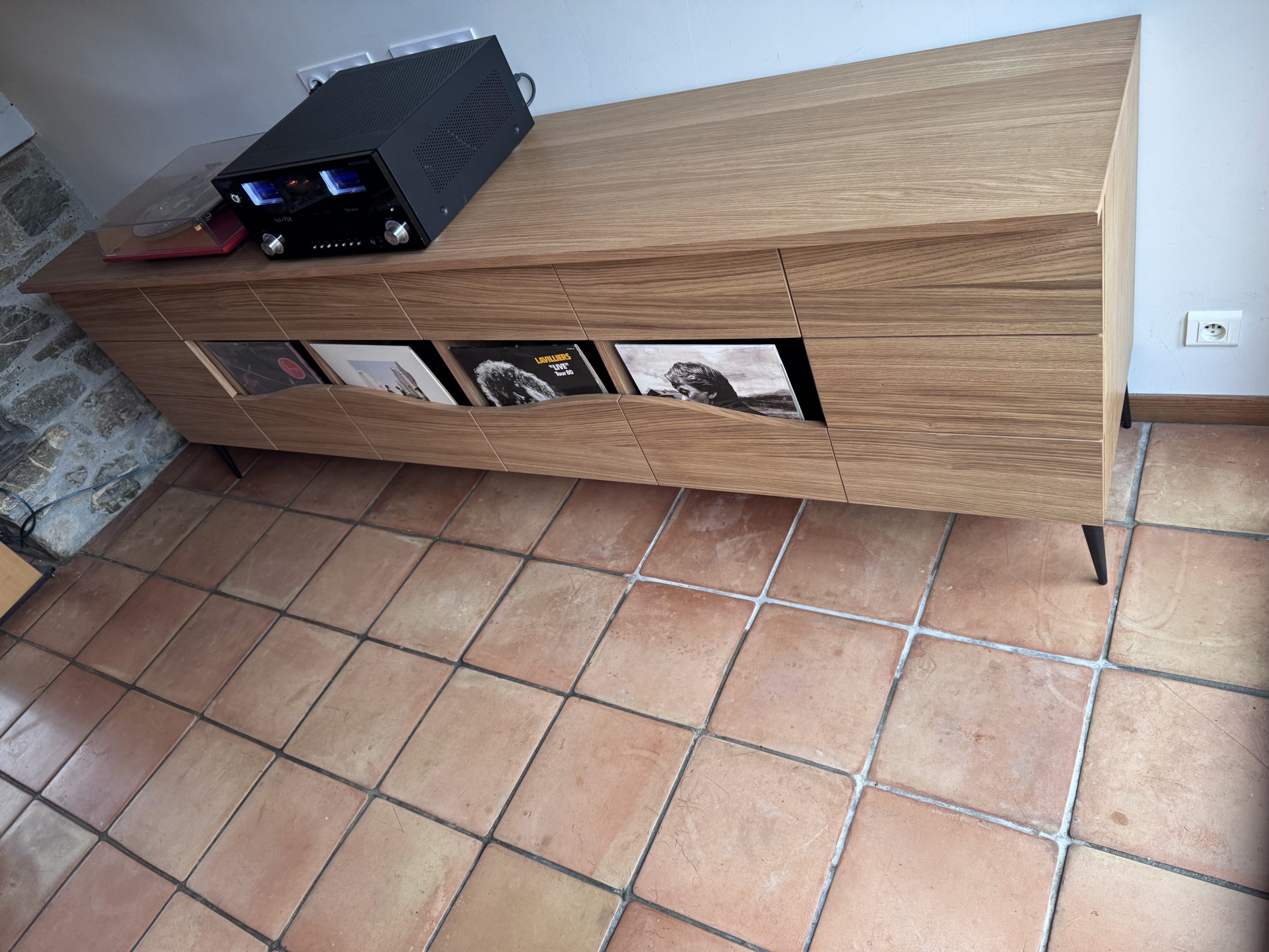 Afin de mettre en valeur la passion de mon client, nous avons opté pour un meuble en 3plis chêne avec comme finition une huile colorée. Tous les tiroirs s’ouvrent par pression afin d’alléger le meuble dans l’espace de vie.