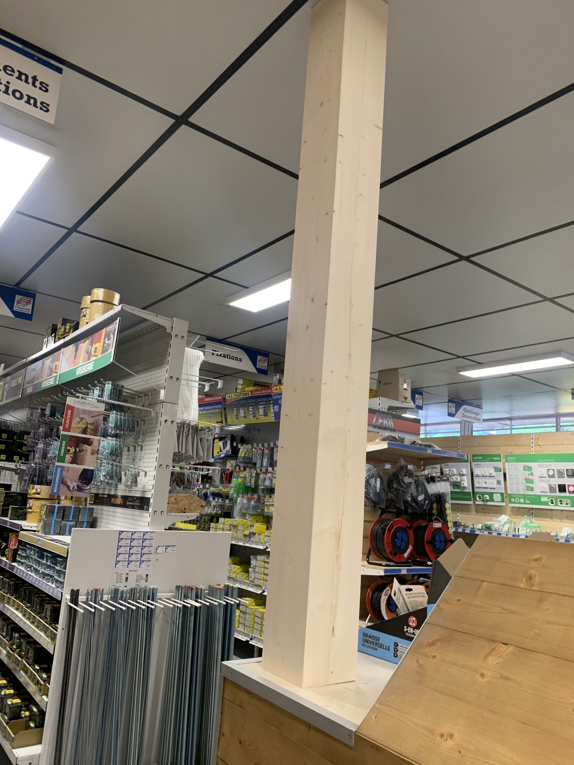 Habillage d’un pilier dans un magasin. Le client l’a choisi en sapin et sert à passer et cacher les câbles. Le bois est un matériau sain et robuste. Il présente aussi des qualités esthétiques car il peut s’adapter dans les formes et dans la structure selon votre intérieur.