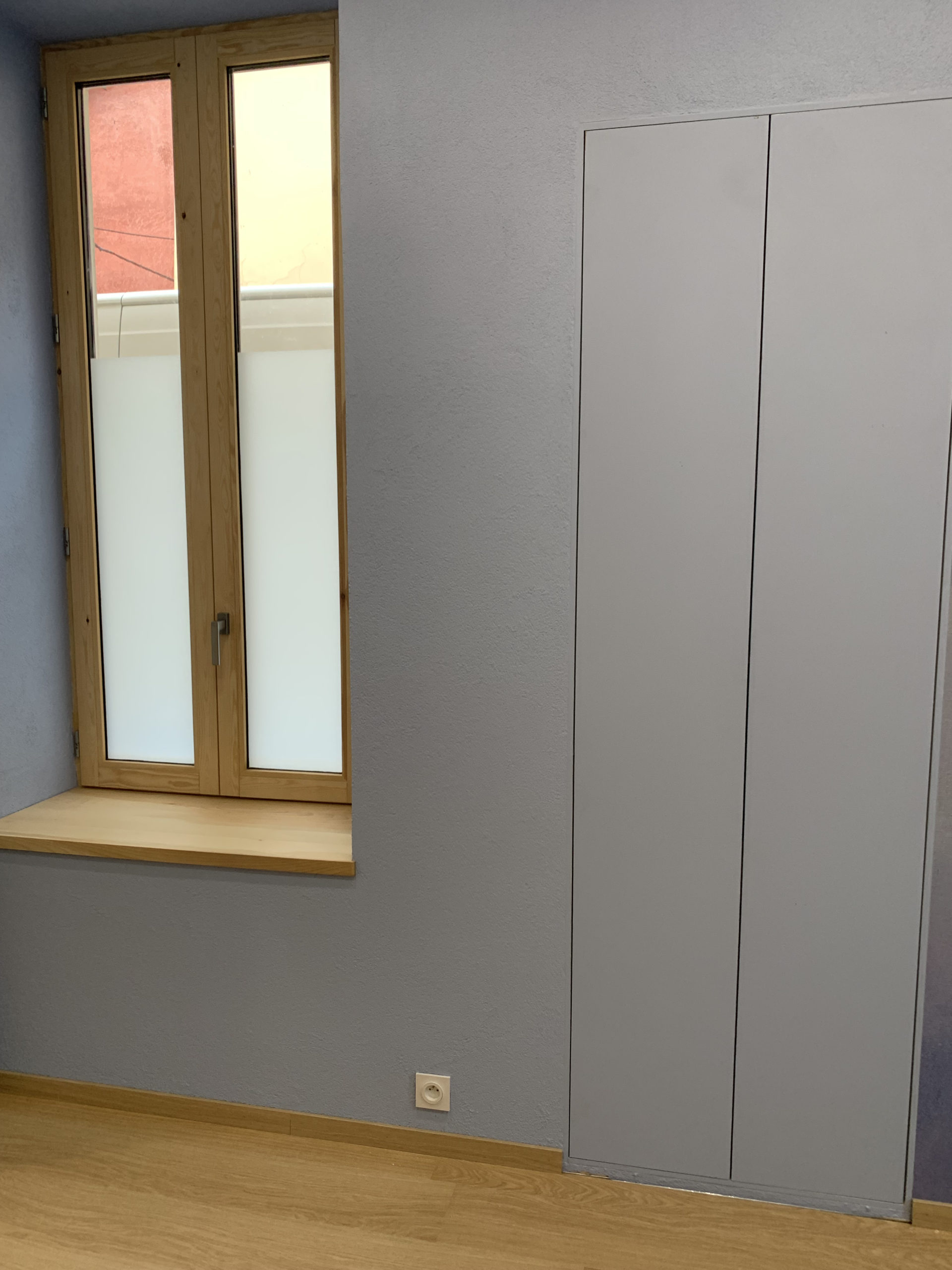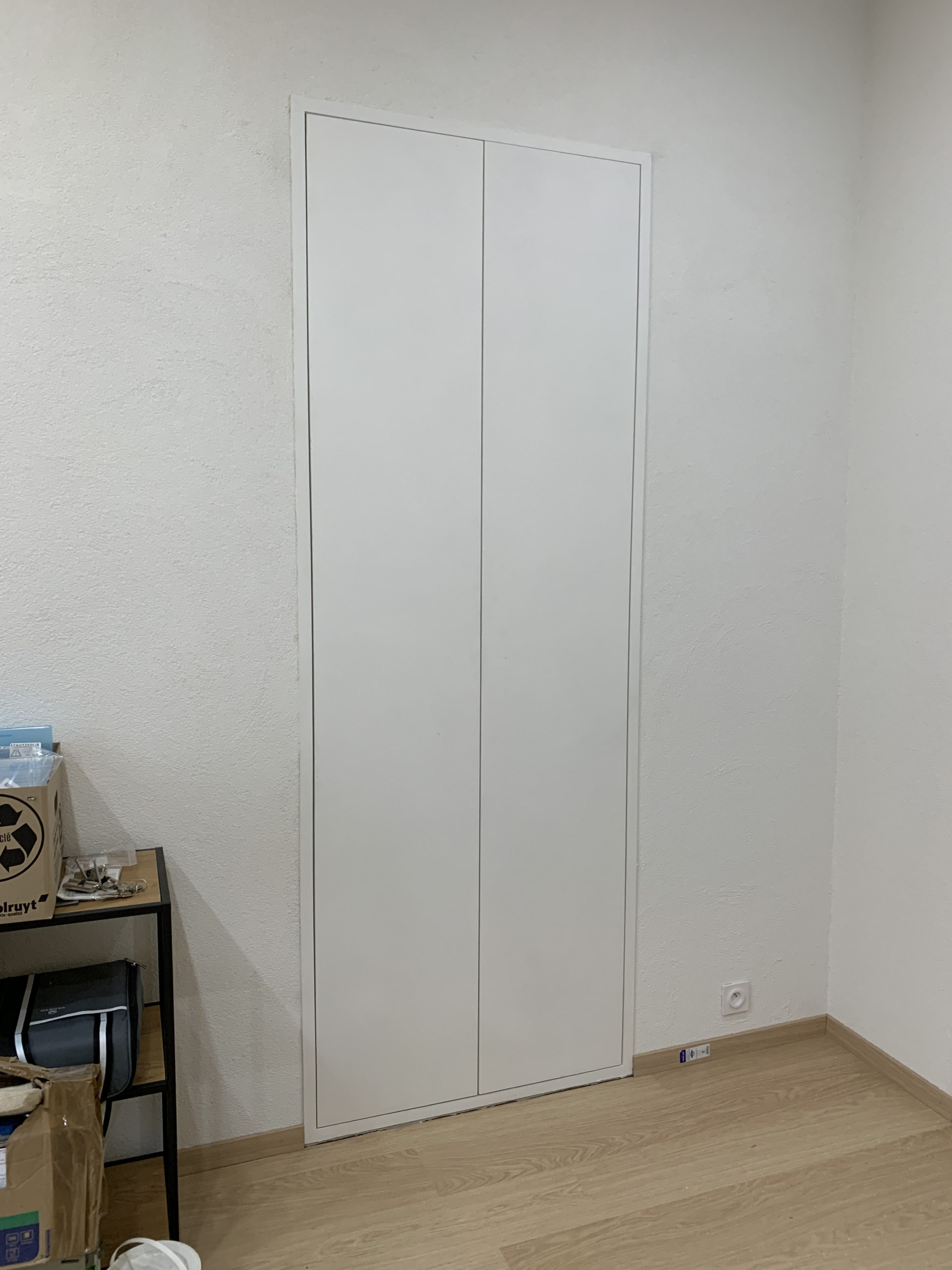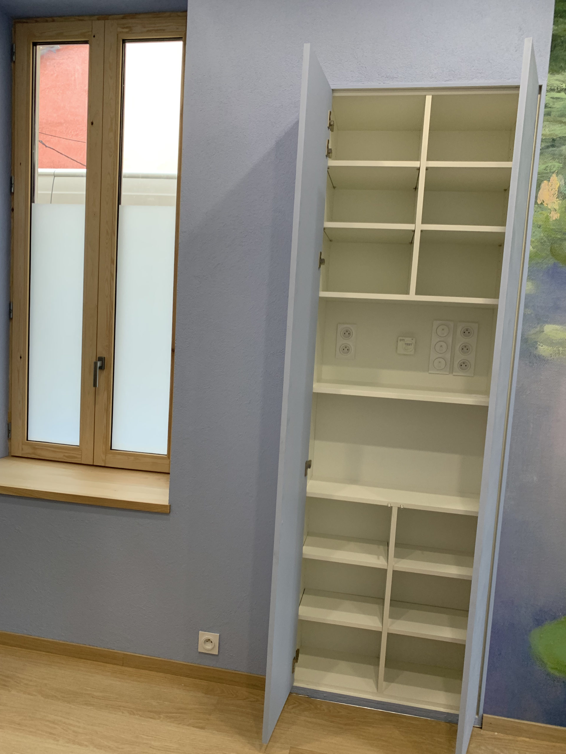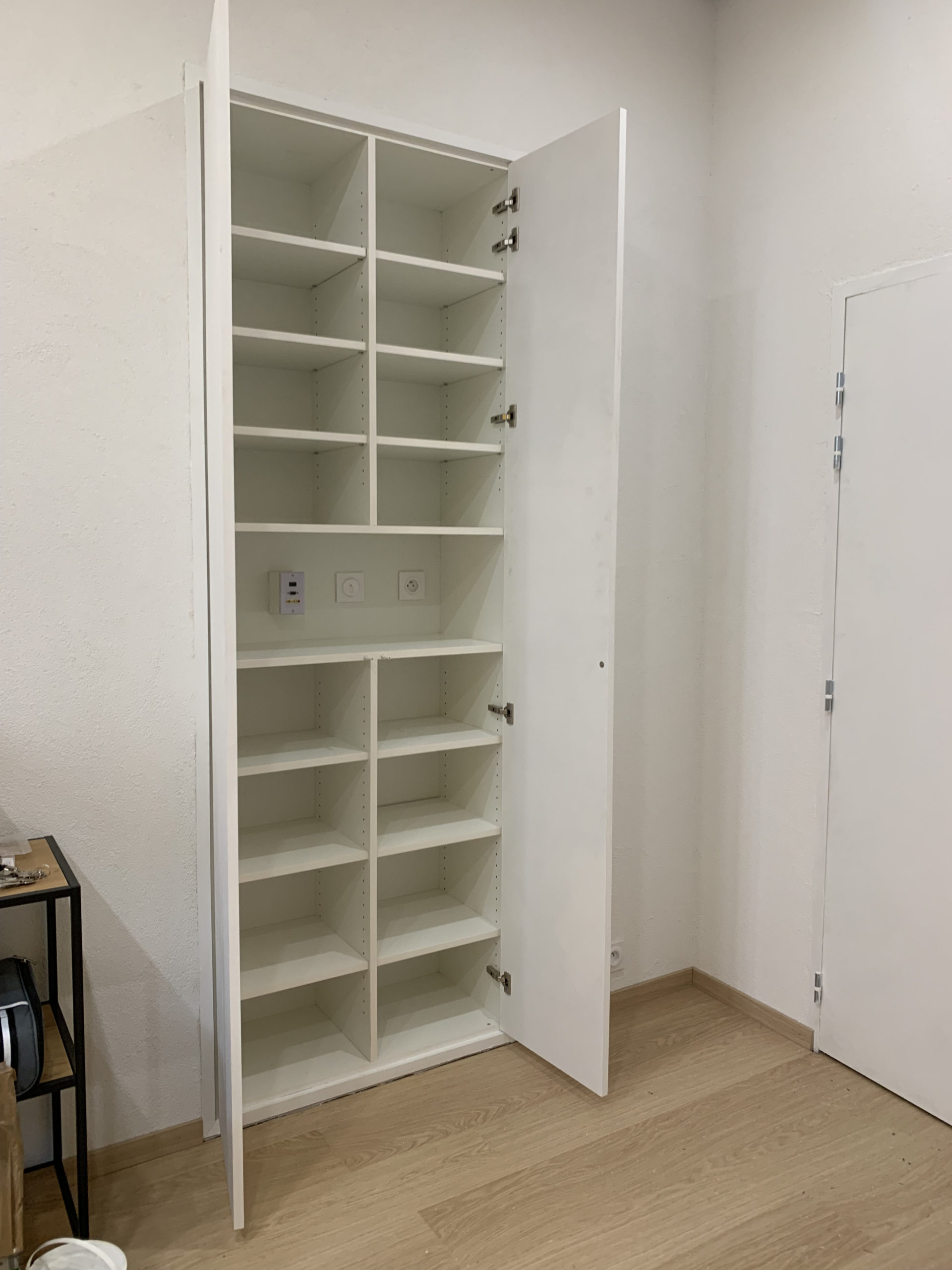 Conception, fabrication et installation de placards sur-mesure insérés dans des niches existantes. De plus, des prises électriques ont été implantées à l’intérieur des placards. Les portes sont en médium peint par la cliente, et l’intérieur est en mélaminé blanc lisse.