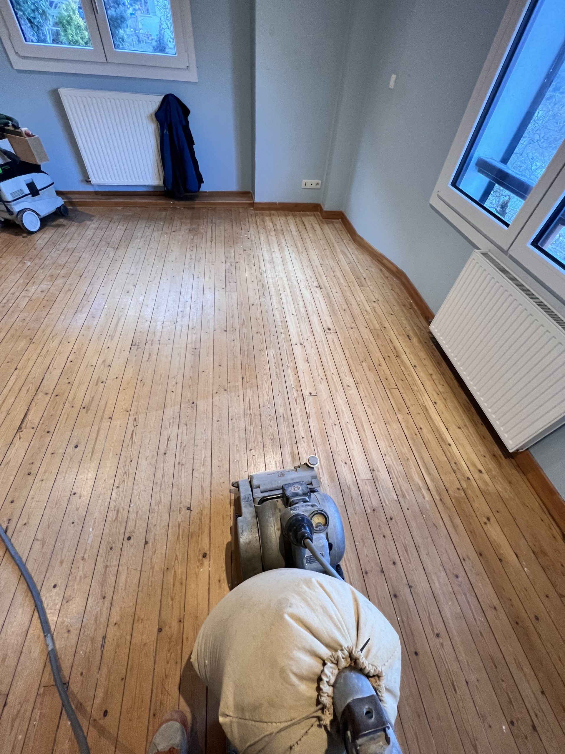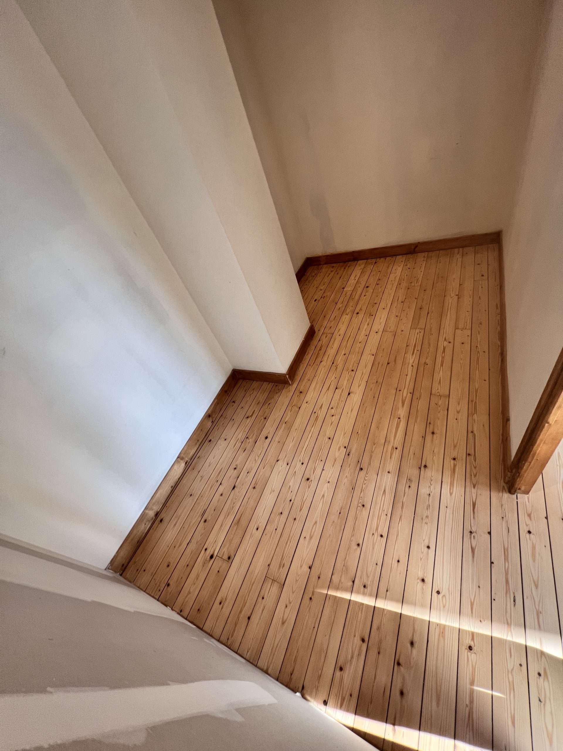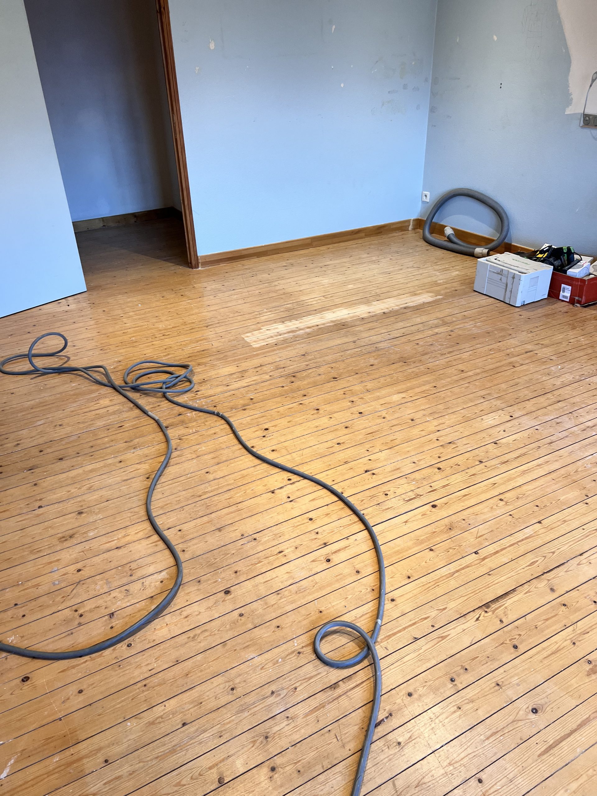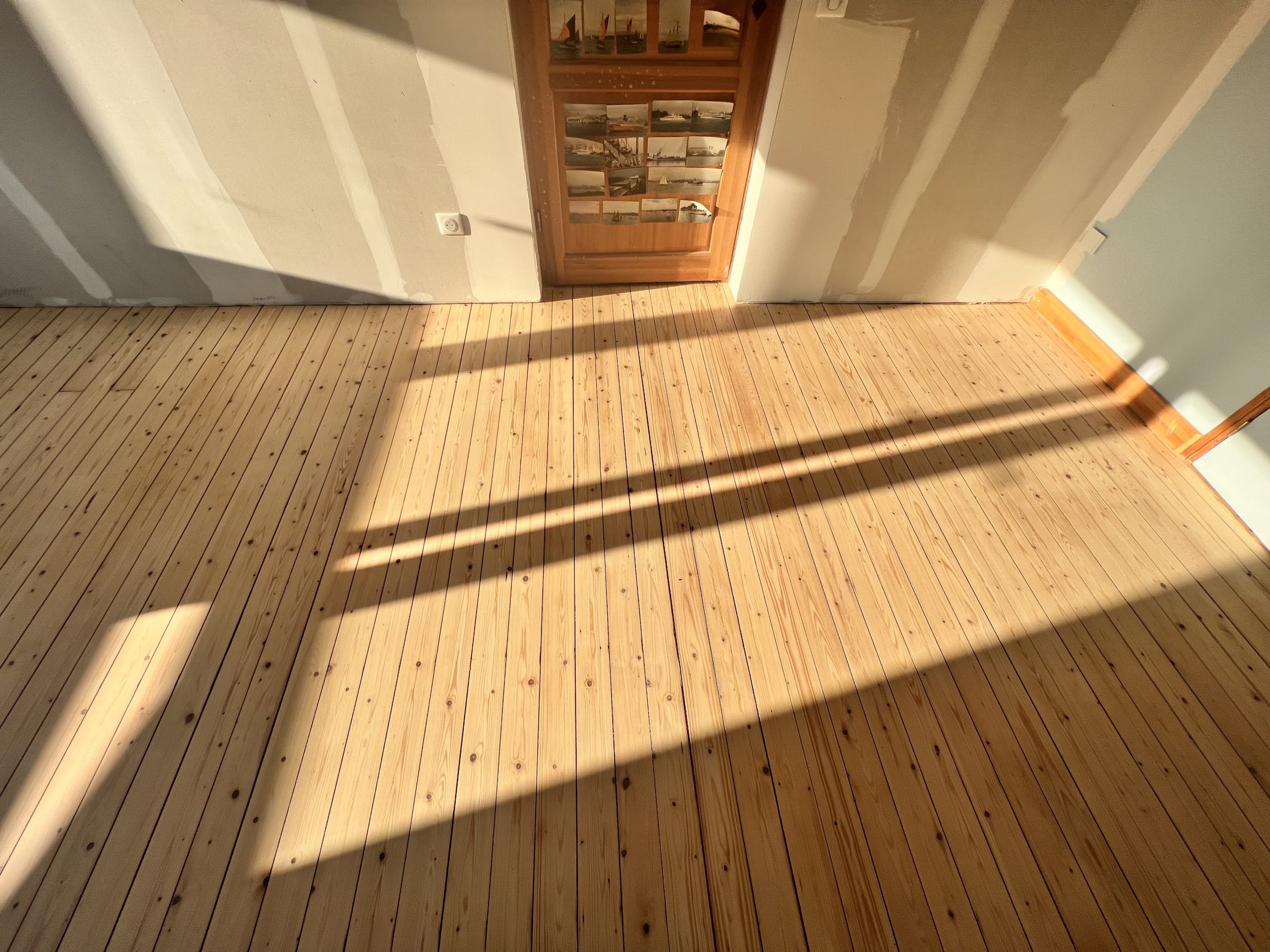 Plusieurs artisans ont collaboré pour la remise à neuf de la chambre. Nous sommes intervenus sur la rénovation du parquet cloué en sapin. Celui ci n’avait jamais été poncé depuis son installation. Nous avons donc poncé à différents grains afin de gommer la totalité des défauts et d’avoir une uniformité de l’ensemble. Pour finir, nous avons appliqué une huile de marque Rubio, qui laisse l’aspect brut du bois.