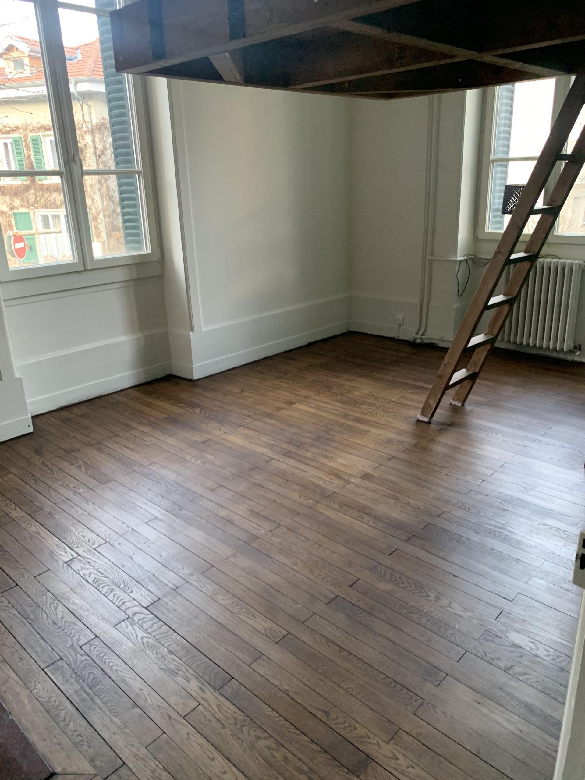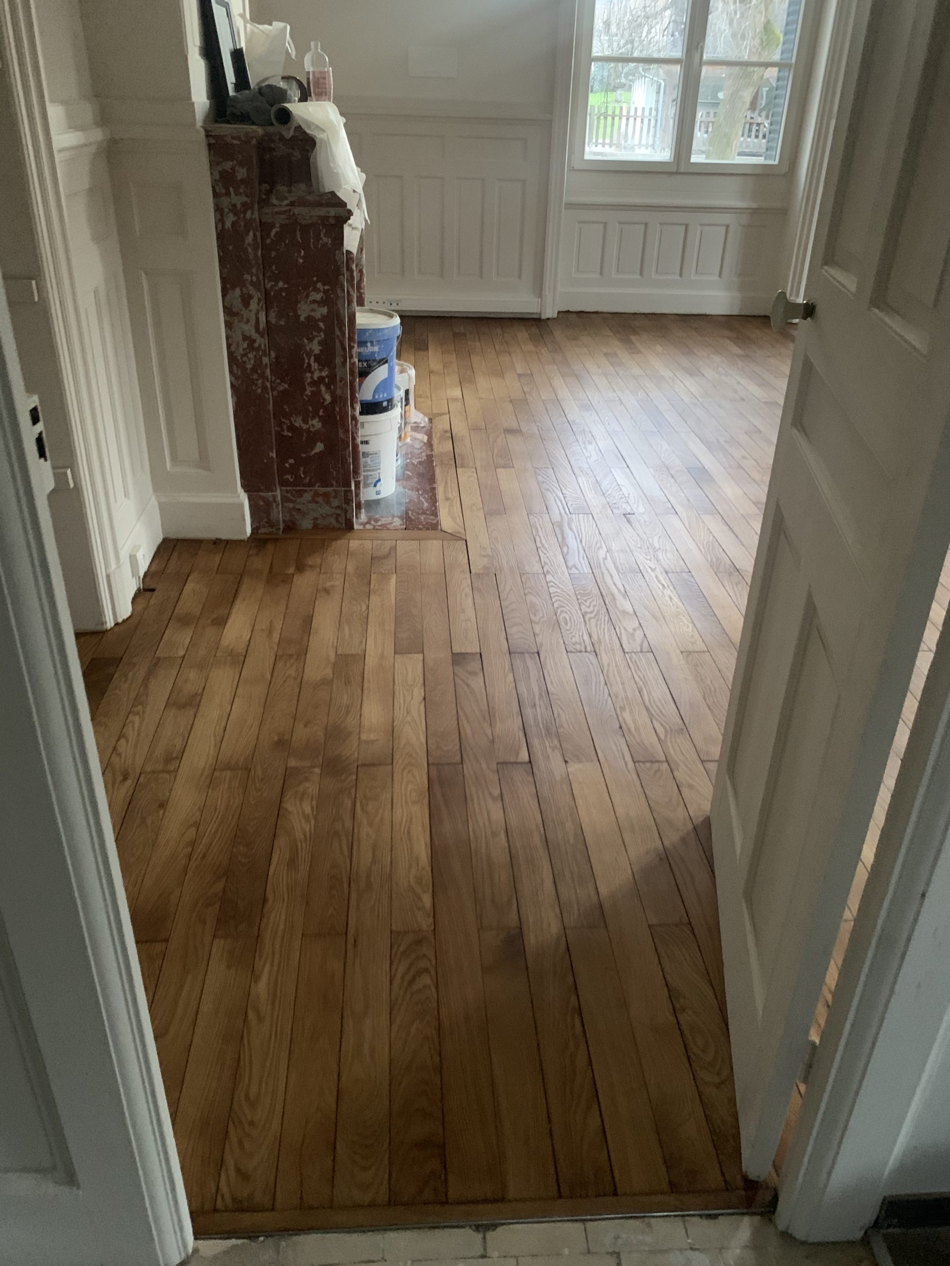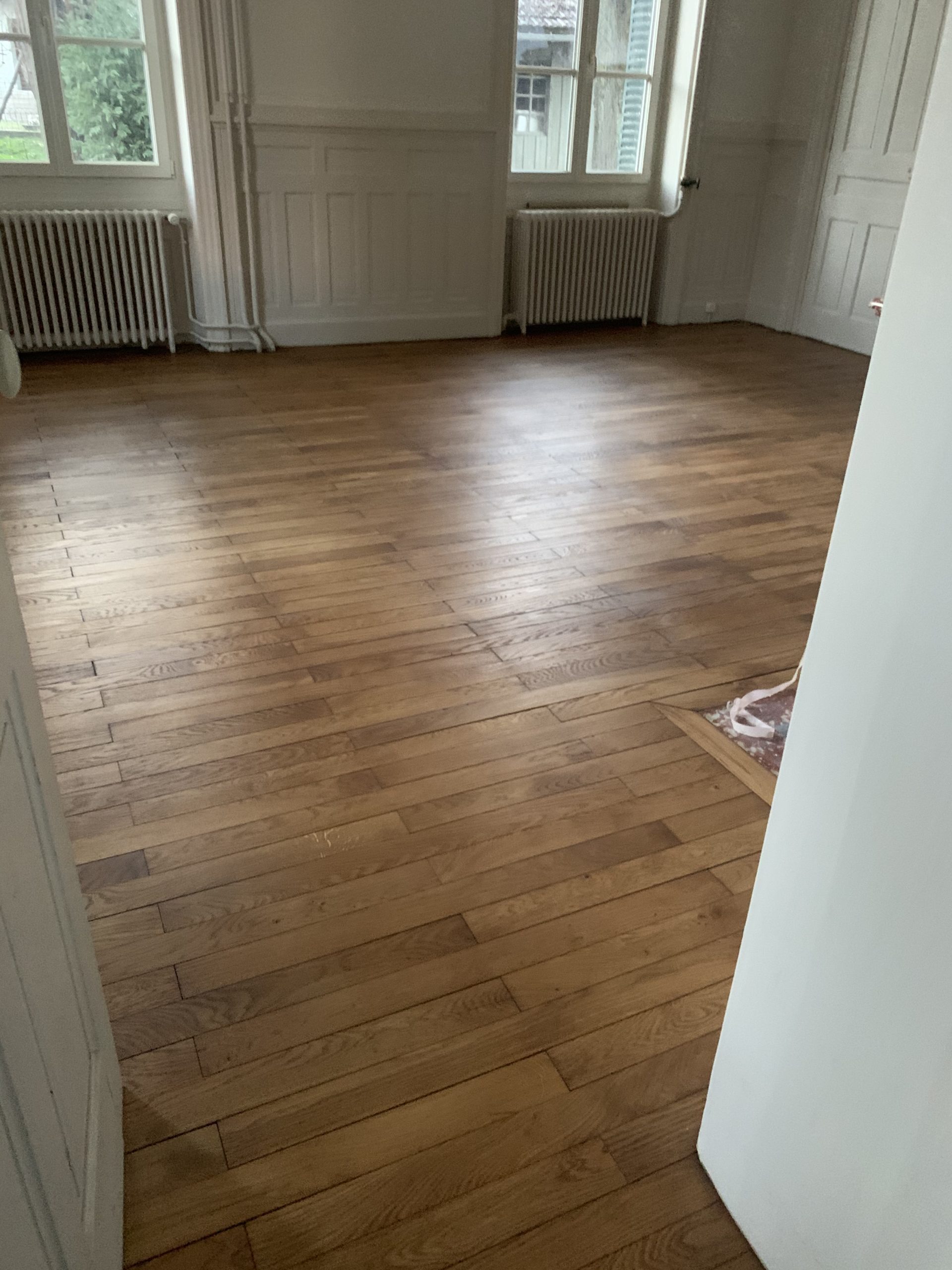 Pour une rénovation durable, nous avons poncé le parquet puis nous avons appliqué l’huile de la marque Rubio. Celle-ci présente l’avantage d’avoir une faible émission de COV et n’est pas filmogène.