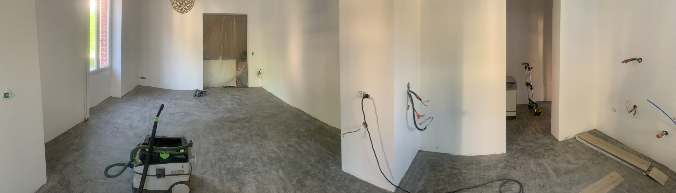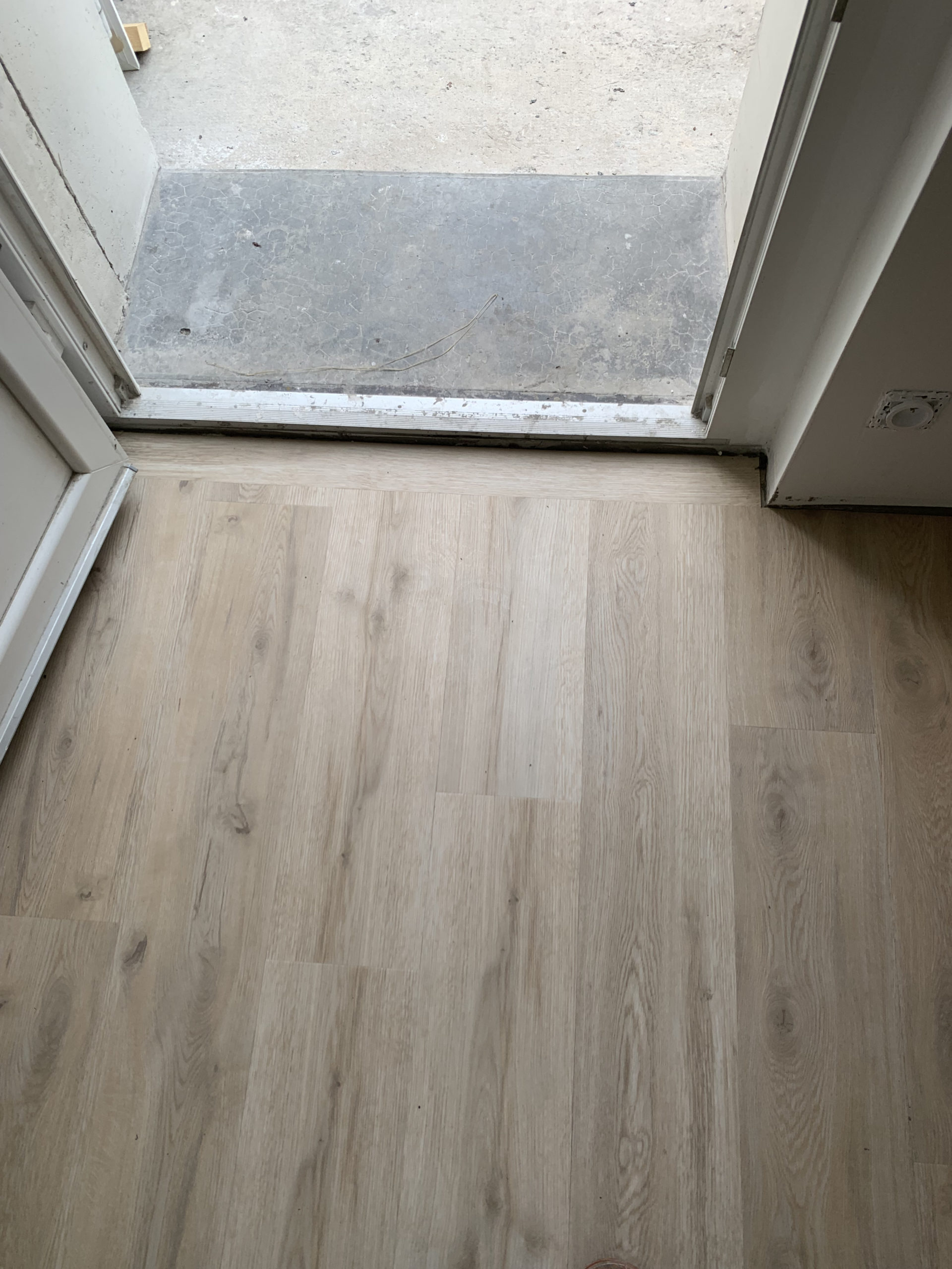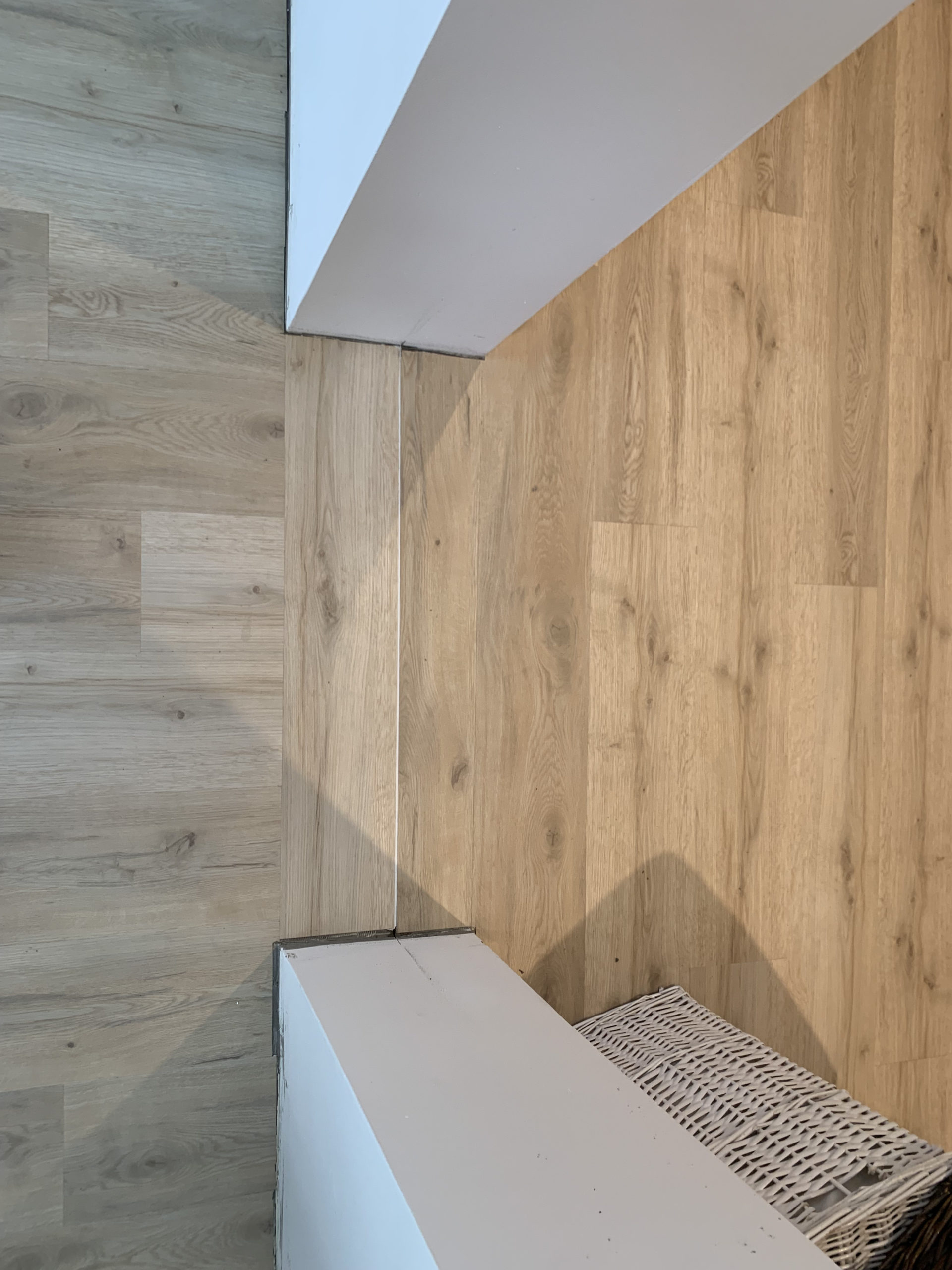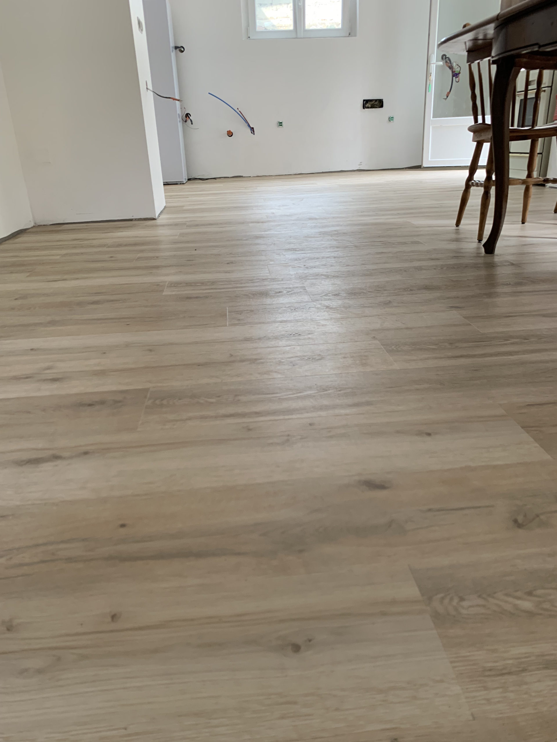 Après avoir coulé un ragréage fibré, un sol vinyle en décor bois a été collé. Nous prêtons attention à chaque détail, que ce soit entre chaque passage de porte, ou à fleur d’un sol existant.