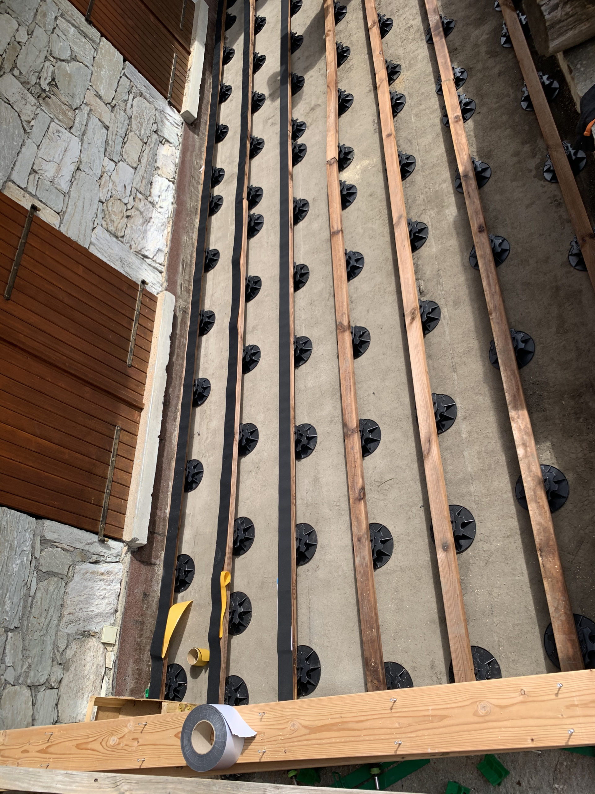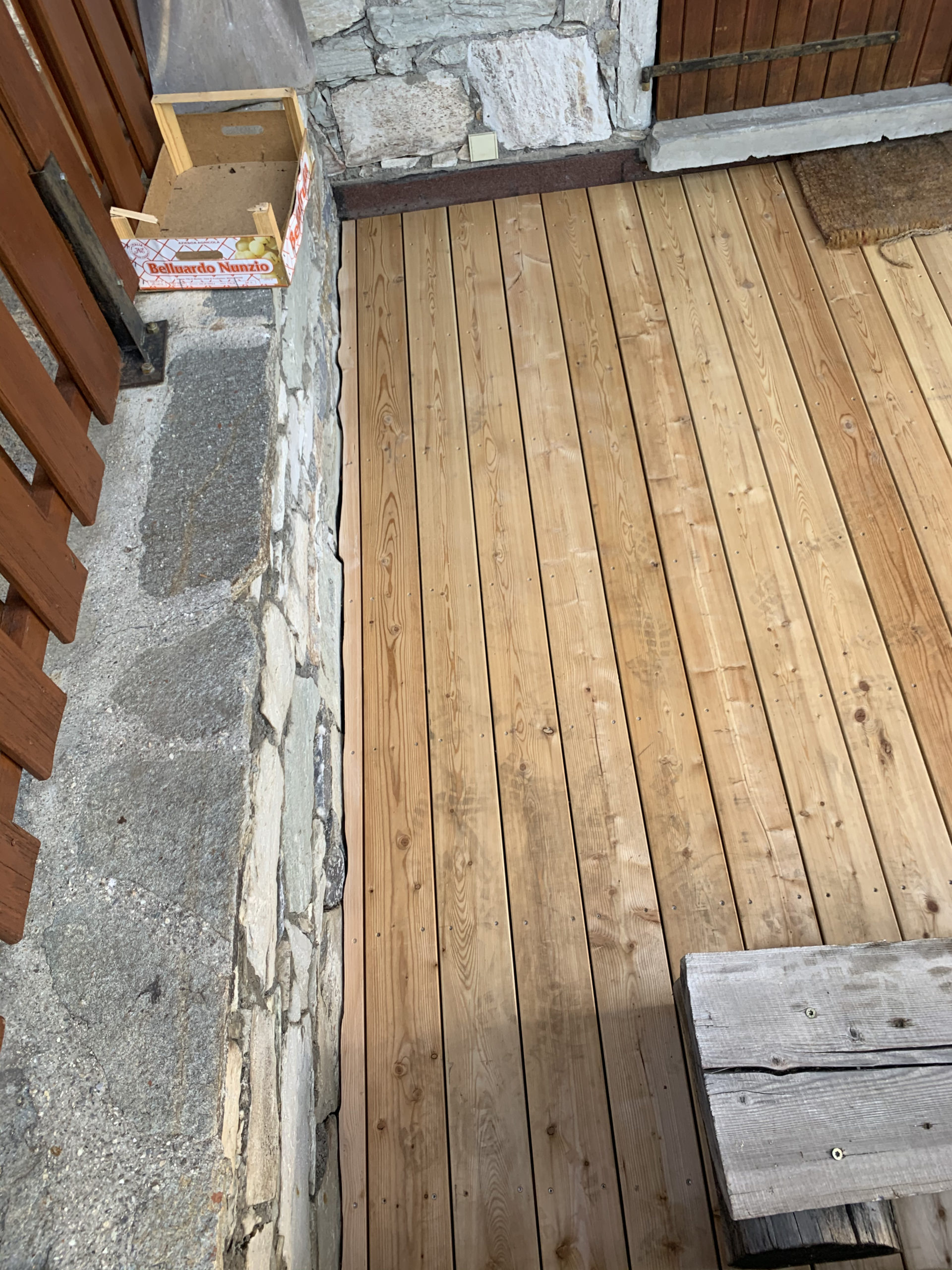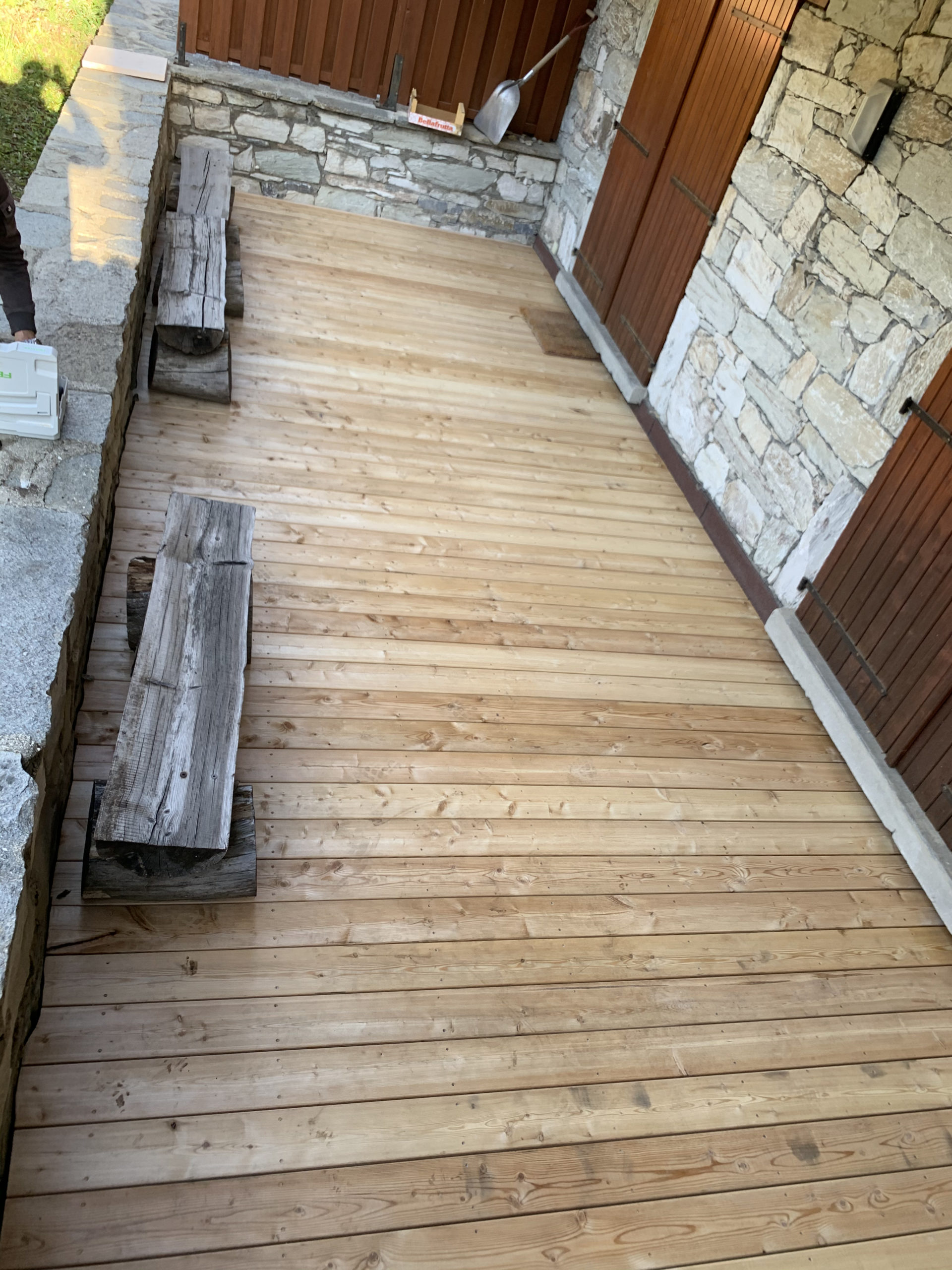 Dépose d’une terrasse en sapin pas aux normes et qui mettait donc en péril par son utilisation. Fourniture et installation d’une terrasse en sapin traité classe 4, posée sur plots.