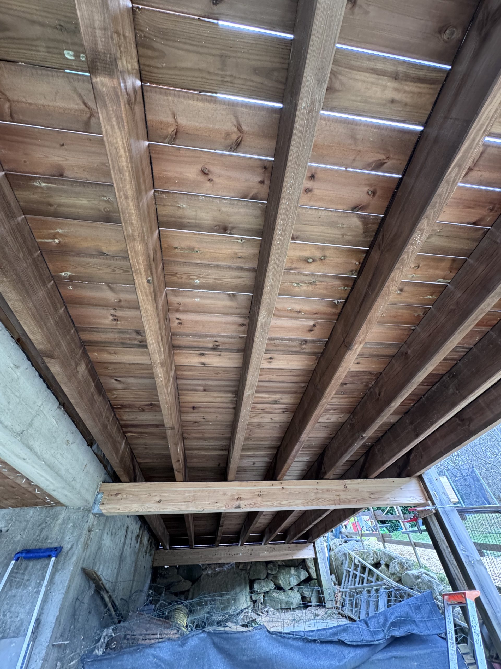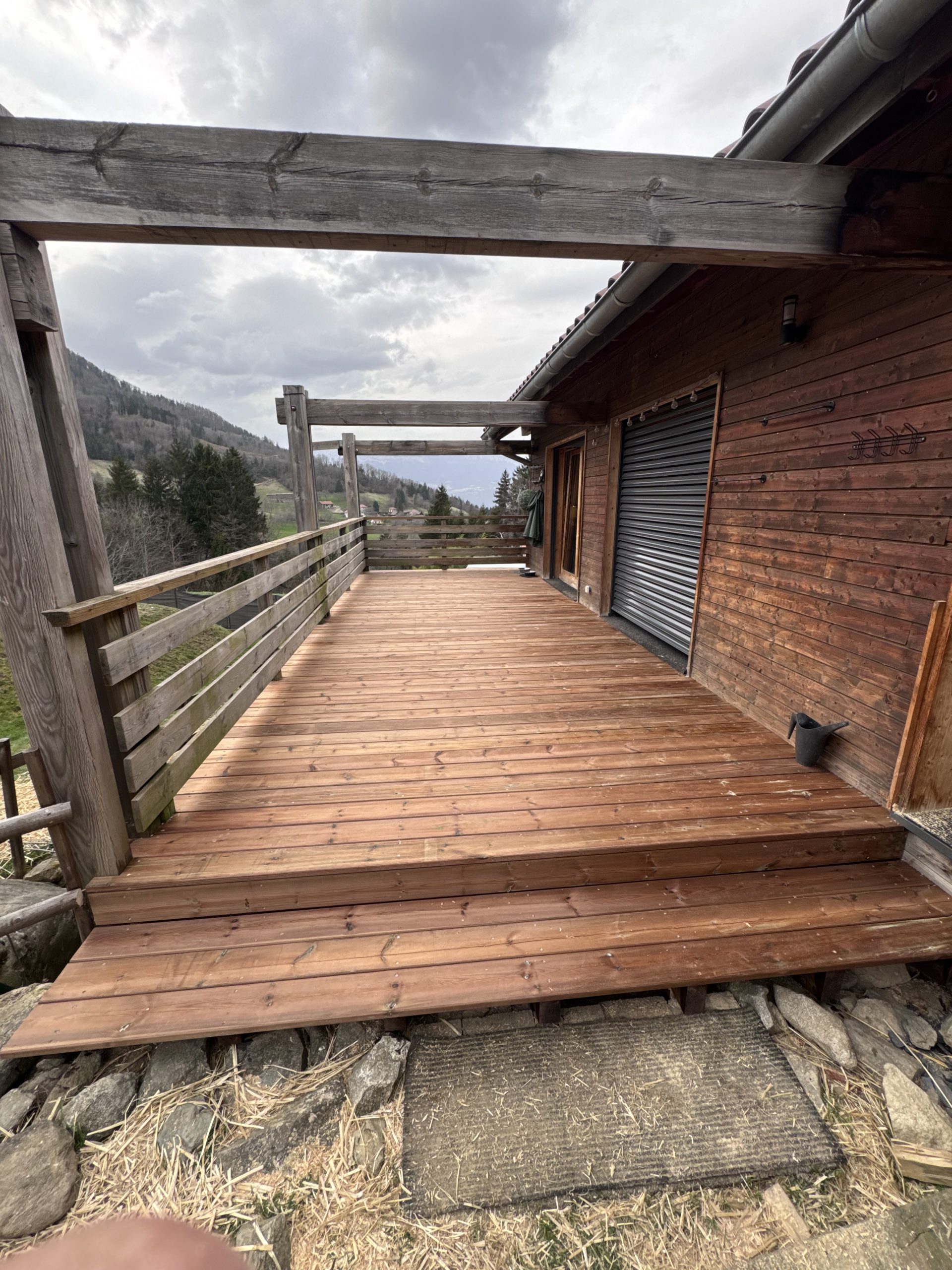 Dépose d’une terrasse en sapin pas aux normes et qui mettait donc en péril par son utilisation. Fourniture et installation d’une terrasse en sapin traité classe 4, posée sur une structure en Meleze( classe 3 naturelle.