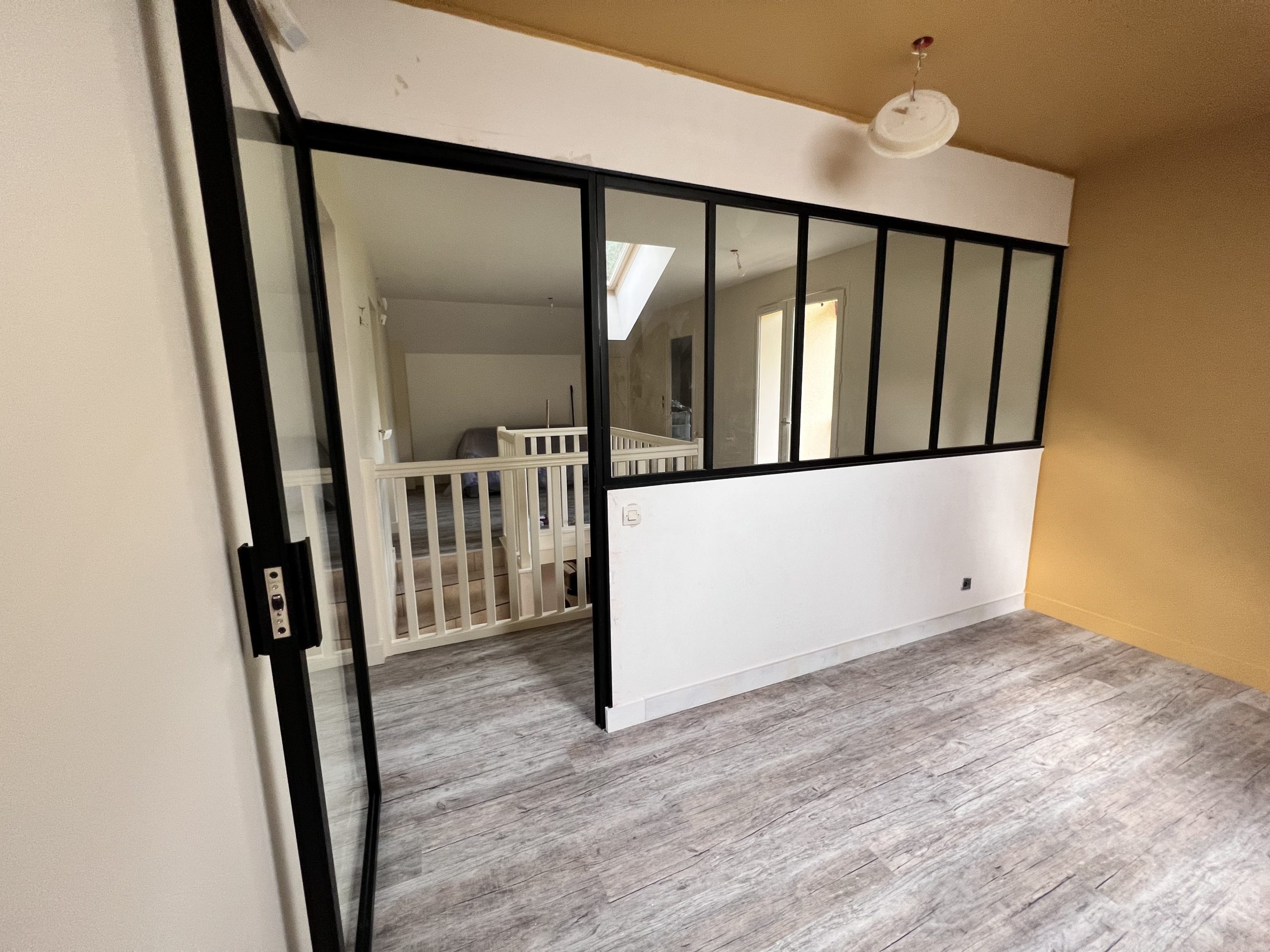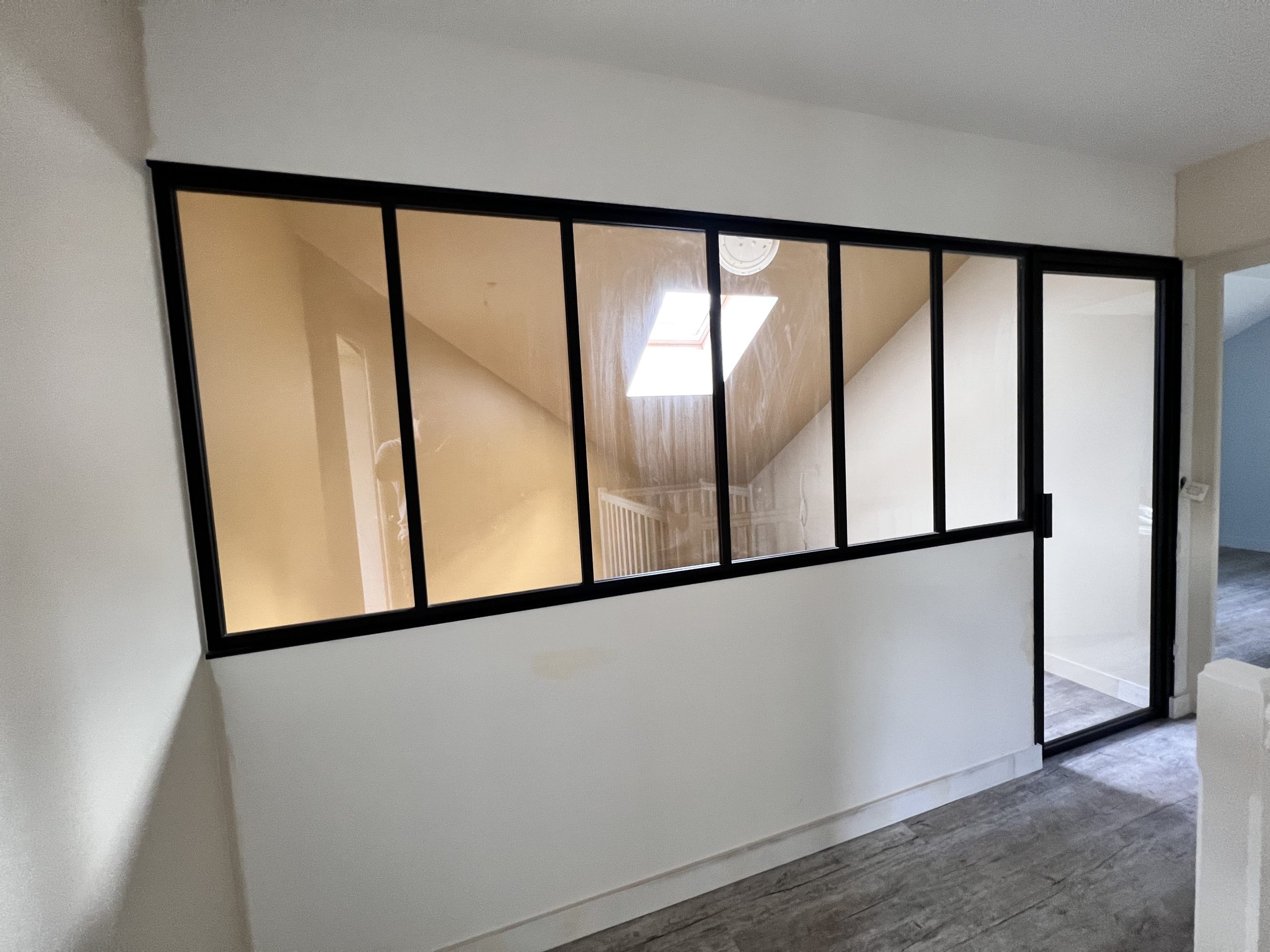 Cette verrière en aluminum peinte en noir mat et en verre feuilleté permet de donner de la luminosité et de la profondeur à la montée d’escalier. Par ailleurs, elle permet de garder l’insonorisation dans le bureau.